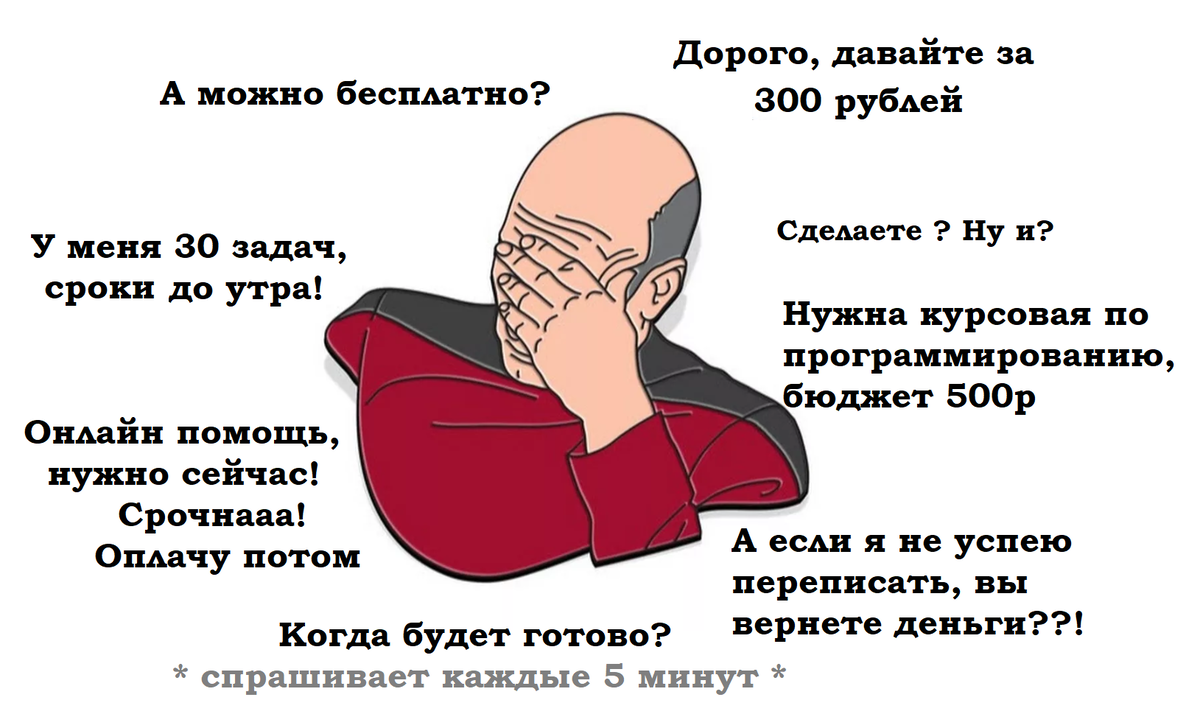 Как только начинается сессия, как только поджимают сроки, заказчики активизируются, начинается броуновское движения, просыпается вялая мотивация учиться, начинаются шевелиться лапки и извилины, но.... какая досада, оказывается, непонятно как делать, и разобраться за 5 минут не удается. Приходится отправляться на поиски спасителя. Грамотное ТЗ, конечно же не нужно. Бюджет 500 деревянных на работу любой сложности. Переделки по вине заказчика в 90 % случаев всегда планируется исправить за счет исполнителя.