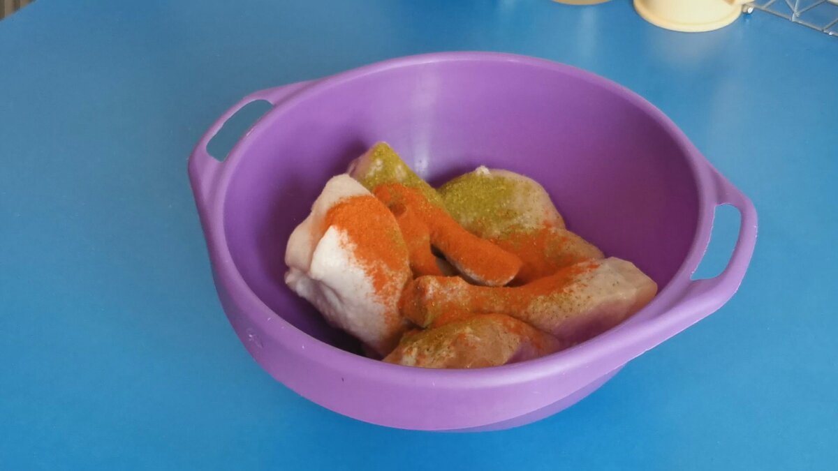 Соль, перец само собой разумеется, также добавляем хмели-сунели и паприку. Всё это заливаем небольшим кол-вом масла, перемешиваем, чтобы приправы лучше разошлись.
