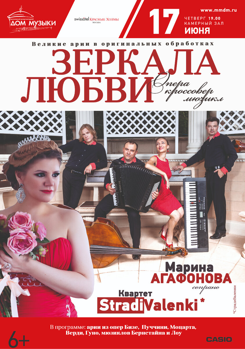 Абсолютные хиты на все времена – любимые арии из опер и мюзиклов в эксклюзивных аранжировках – представят сопрано Марина Агафонова и квартет StradiValenki.