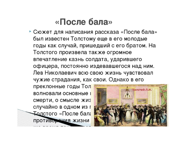 Краткое содержание: Первые строки повествования – дискуссия умудрённых опытом друзей о том, может ли окружающая среда повлиять на судьбу человека. Один из них, Иван Васильевич, считая, «что всё дело в случае», предлагает послушать историю из его жизни. Его рассказ начинается с описания бала в доме губернского предводителя. Счастливый Иван Васильевич наслаждается общением с любимой девушкой. Всё ему кажется замечательным: чудесные добрые хозяева, красивые наряды, ослепительная зала, весёлая музыка. На протяжении вечера герой не сводит глаз со своей любимой. Он с восторгом наблюдает за танцующим полковником и его дочерью. Умиляется его старинными, с четвероугольными носками и без каблуков, сапогами, думая о том, что отец ради Вареньки экономит на себе и идёт на жертвы. Молодой человек готов любить весь мир. «Я был не только весел и доволен, я был счастлив, блажен, я был добр, я был не я, а какое-то неземное существо, не знающее зла и способное на одно добро», – вспоминает рассказчик. Окр