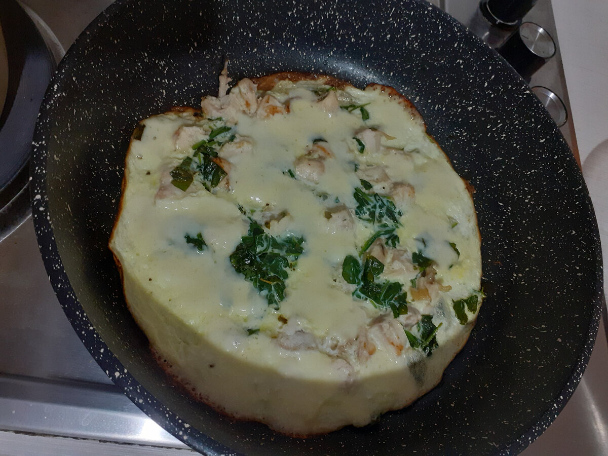 Всем привет! Сегодня у меня рецепт вкусной лепешки, которая готовиться быстро и просто. По приготовлению весь процесс займет 10 минут. Единственное, что в наличии у вас должен быть кусочек отварного куриного мяса. Лепешка уместна на завтрак, перекус в течении дня или ужин. Делюсь рецептом. Способ приготовления: Шпинат моем, обсушиваем бумажным полотенцем и нарезаем широкими кусочками. Зеленый лук, моем, обсушиваем и нарезам (тоже не очень мелко). На сковороде растапливаем кусочек сливочного масла Выкладываем шпинат и зеленый лук в масло и тушим на среднем нагреве 3 минуты. Отварную курицу нарезаем кубиком. Готовим заливку : яйцо смешиваем с молоком, солим. Добавила в заливку приправу: прованские травы Курицу выкладываем к зелени, обжариваем пару минут Заливаем приготовленной заливкой зелень и куру. Нагрев делаем минимальный. Сыр моцареллу нарезаем брусочками Выкладываем моцареллу в сковороду Закрываем сковородку крышкой. Готовим еще примерно 2-3 минуты, до полного расплавления сыра.