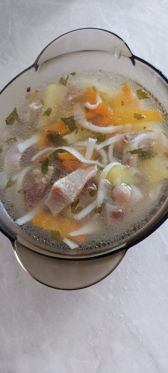 Ингредиенты : Сначала нужно промыть кости,далее в кастрюлю наливаем холодную воду кладем кости ,зажигаем газ , ждем когда закипит(периодически снимая пену),позже на медленном огне варим кости 1час. А пока варятся наши косточки делаем домашнюю лапшу, чистим картофель ,морковь и лук. После того как кости с мясом сварились достаем их из воды ,даем немного остыть,а в это время в кастрюлю кладем нарезанный брусочками(или кому как удобно) картофель. варим 15 мин. Когда мясо остыло отделяем его от косточек и рубим на небольшие кусочки Далее засыпаем мясо в кастрюлю. Делаем зажарку : Морковь трем на терке или режем брусочками ножом, лук режем кубиками. Обжариваем лук до золотистой корочки,кладем морковь и жарим еще 3 мин. Когда готова зажарка кладем ее в кастрюлю и добавляем домашнюю лапшу(ссылка) Варим еще 10 минут,перчим,добавляем зелень.Суп готов. Если вам понравился рецепт ставьте лайки и подписывайтесь на мой канал, дальше будет еще больше интересных и вкусных рецептов