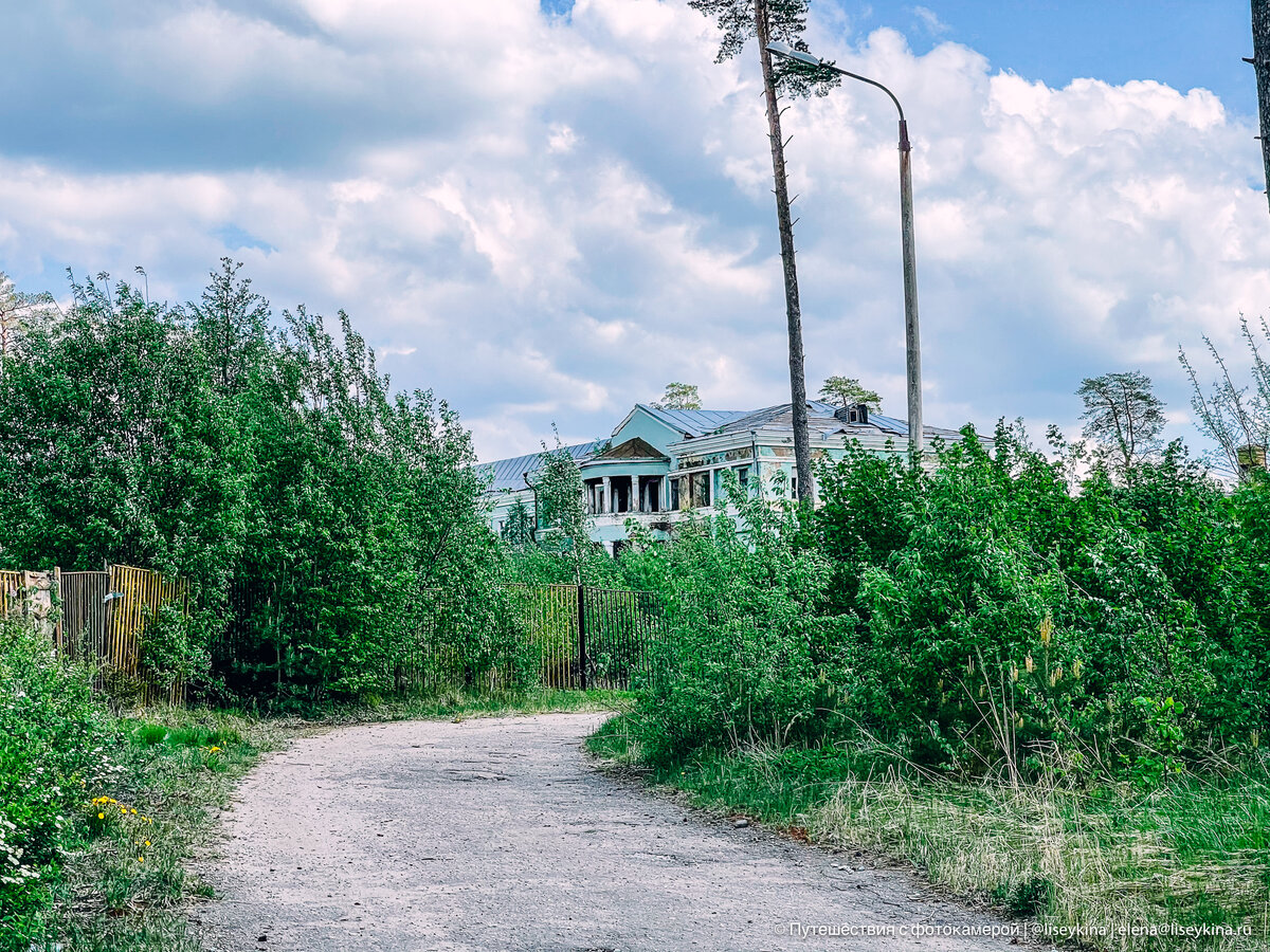 Через поле смогла пройти на территорию, но была "поймана" охранником. Но фотографии для вас смогла сделать. Теперь давайте обо всём по порядку. Большой санаторий для больных сахарным диабетом был самым современным по меркам 1957 года. Да и располагался он в шикарном месте Подмосковья - в сосновом лесу, не очень далеко от Звенигорода. Здесь была и сауна, и бассейн, и стоматологический кабинет, и библиотека, и всякие положенные в санаториях процедурные комнаты вроде душа Шарко и радоновых ванн. Вообще, попасть сюда можно прямо с асфальтовой дороги, но меня смутила ржавая табличка "Частная собственность" и я решила, что въезжать туда на автомобиле будет слишком провокационно. И решила зайти с тыла. Для этого пришлось заехать в соседнюю деревню, оставить машину среди коттеджей и 500 метров прогуляться по полю пешочком. Зато пока шла, придумала оправдание для охранников: "Гуляла вокруг дачи, увидела интересные строения и решила узнать, что там внутри". И это даже правда :) Отмазка, кстати