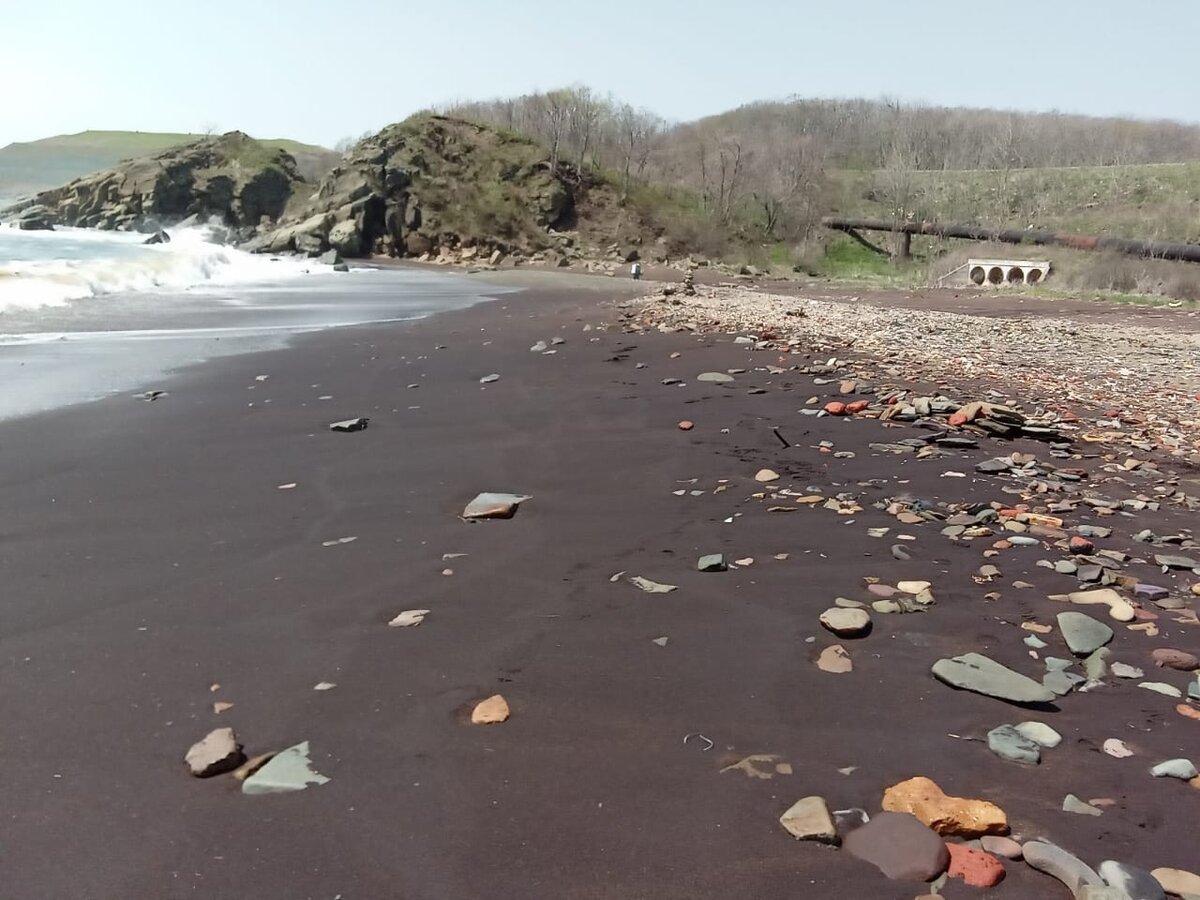 Следующая бухта, после поселка Рыбачий, к которой возможно спуститься находится за бывшим полигоном твердых бытовых отходов. Помню как несколько лет назад невозможно было проехать по трассе из- за дыма идущего от свалки. Сегодня свалки нет. Её завалили и сделали что- то наподобие египетской пирамиды. И дыма тоже нет, даже вкопанные трубы дымящиеся еще несколько лет назад молчат. Полюбовавшись зеленой пирамидой, спустилась к следующей бухте. К своему стыду не знаю ее названия. Так вот дорога от трассы к морю вроде бы есть, и судя по следам протекторов кто -то спускался к морю на машине или бронетранспортере уж не знаю. Я пошла пешком. Красивое и необычное место! Если встать лицом к морю то с левой стороны песок абсолютно черный. И на нем красиво выделяются ярко красные и оранжевые осколки битого кирпичи старательно обтесанные морем. Попадались непонятные каменные дуги, похожие на половину круга.