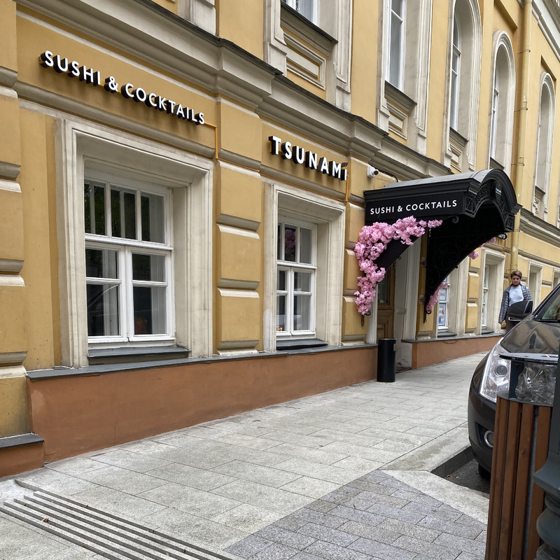 Благовещенский переулок продолжает пополняться новыми заведениями общественного питания. Последним таким новобранцем стал азиатский ресторан-бар Tsunami Sushi & Cocktails, который раньше работал только с доставкой. Вход – в череде дверей недавно открывшихся точек, под черным козырьком. Рядом вечно цветущая искусственная сакура и белая вывеска.