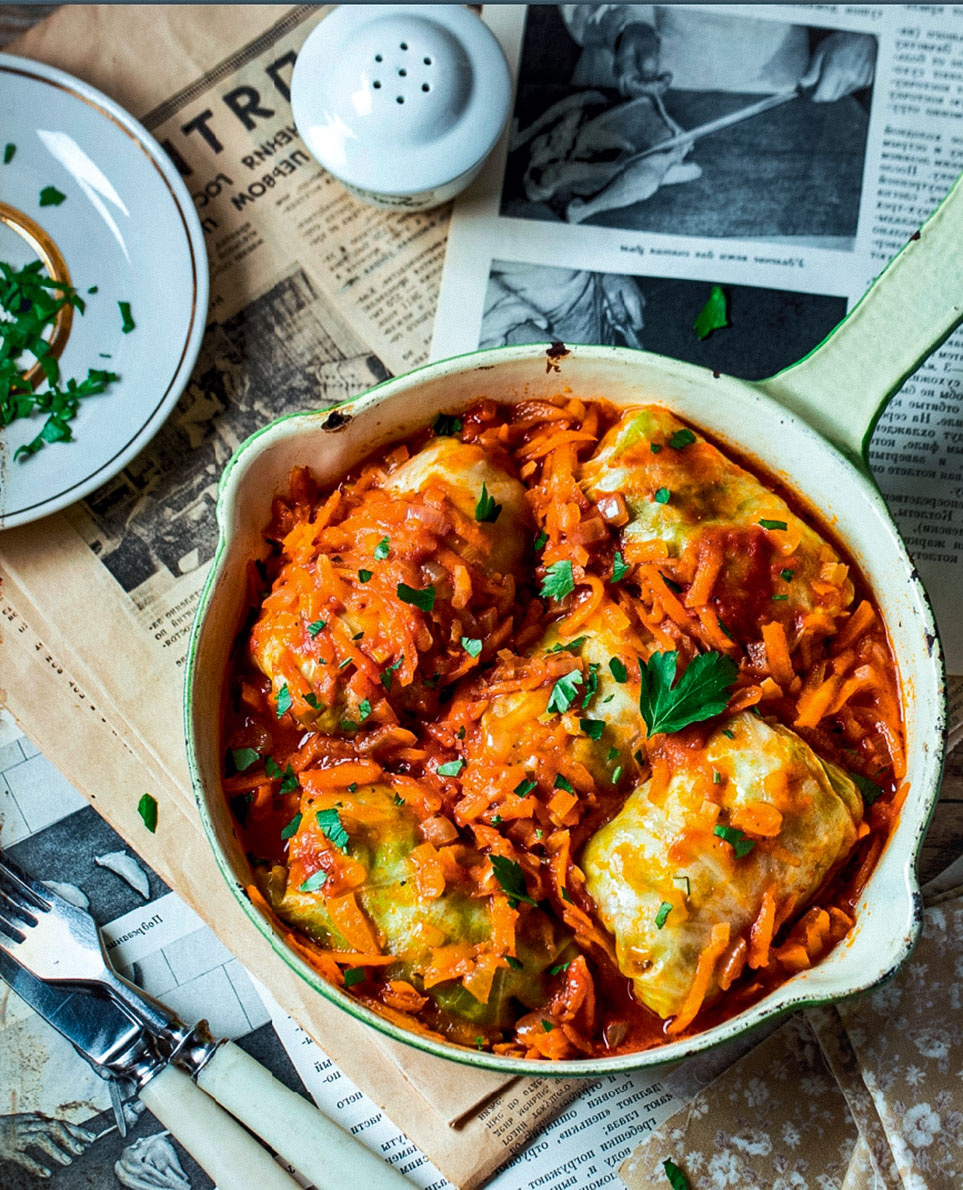 Голубцы — блюдо восточно-европейской кухни, состоящие из мясного, реже из овощного фарша с добавлением отварного риса (или гречневой крупой) и завернутые в капустные листья. В основном голубцы настоящие готовят только лишь в России, Белоруссии и Украине. Иногда голубцы, например в дни строгого поста, некоторые хозяйки готовят исключительно овощные, заворачивая в капусту пережаренные овощи. В таком виде домашние голубцы тоже получаются очень вкусными. Кто-то любит заворачивать голубец в большой, объёмный капустный лист, ведь в таком исполнении голубцы получаются намного вкуснее и сочнее (это кстати на мой вкус и вкус моей семьи), а кто-то даже предварительно режет листья на несколько частей. Тут уже каждая хозяйка готовит так, как привили ей с детства или как больше нравится. Голубцы –настоящее блюдо-конструктор, потому что готовить его можно с любой начинкой на ваш вкус. Классикой считается смешанный мясной фарш из говядины и свинины в соотношении 1:1, но лично я предпочитаю сочетание