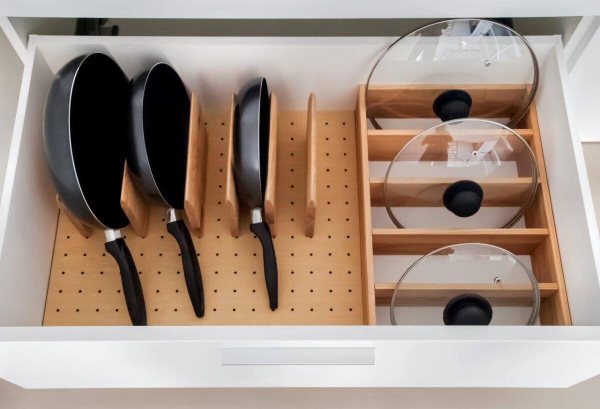 На кухне всегда хранится большое количество разного инвентаря, посуды, столовых приборов, моющих и чистящих средств. Чтобы площадь кухни использовалась рационально, а время, проведенное на кухне приносило только положительные эмоции, позаботьтесь об организации удобного пространства в зоне приготовления пищи. Мы подготовили для вас подборку идей удобного размещения кухонных принадлежностей. Ящики против полок Давно известно, что посуда и инвентарь, лежащие в глубине и в дальнем углу шкафа, почти никогда не используются, а только занимают место. Даже если они нужны, про них часто забывают. Лучшая альтернатива стандартным полкам — выдвижные ящики. В них удобно рассортировать предметы по виду и назначению, чтобы можно было легко и быстро найти нужную вещь. Если на кухне дефицит свободного места, дополнительные ящики для хранения противней, форм для выпечки, корма и аксессуаров для питомцев, можно сделать в цокольной части нижних шкафов. Разделители для идеального хранения Чтобы в ящиках и