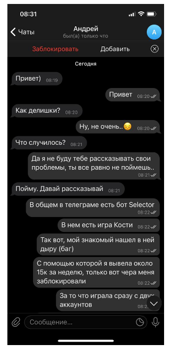 Данная статья не призывает к мошенничеству и подобным схемам, а только рассказывает о способе обмана доверчивых пользователей. Суть обмана: вас просят помочь сыграть по схеме за вознаграждение в боте, вы выводите на кошелёк скамера, вы пополняете баланс и потом ещё и ещё. В итоге вы остаётесь ни с чем Как всё происходит(со скриншотами) Обычно знакомство с жертвой происходит под видом милой девушки. Чаще всего это происходит в Леонардо Дайвинчике - группе вк для знакомств. Так вот, вам пишет милая девочка с якобы плохим настроением, общается и всё таки рассказывает о своей проблеме и просит помочь ей сыграть в азартную игру КОСТИ в боте в Telegram, где её заблокировали. И, конечно, нам за это дадут вознаграждение. Всё проходит под условием, что от нас ничего не требуется, а только играть по схеме. Далее вы пополняете баланс, а точнее та девушка для вас его пополняет, говорит куда ставить и о чудо, вы выигрываете хорошую сумму! Далее вас просят вывести на qiwi/карту/yomoney и вы выв
