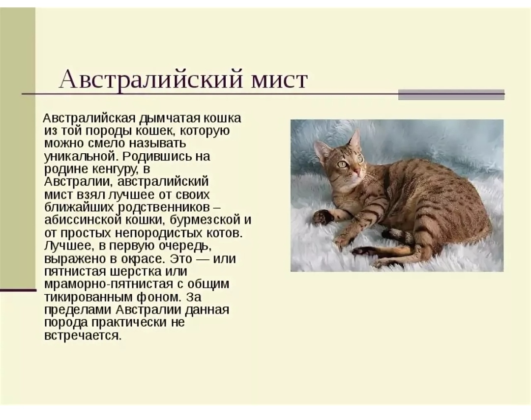 Всем привет дорогие друзья. Эта статья будет про породы котов. Австралийский мист. Канадский сфинкс. Британский длинношерстый. Абиссинская кошка. Мейн кун. Всем пока. Надеюсь вам понравилась эта статья про котиков. 🐈🐈🐈🙂🙃🙂