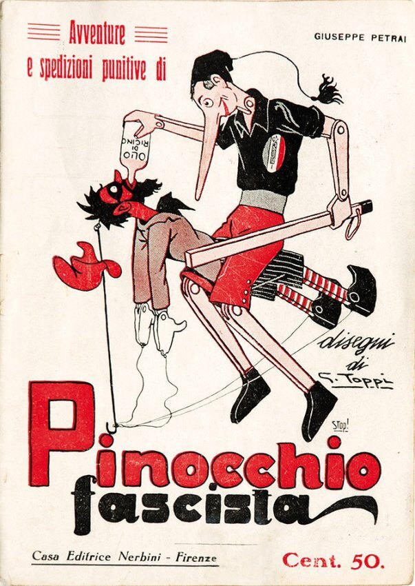 Обложка этой сказки (представлена выше) говорите сама за себя. На ней Пиноккио в традиционной черной рубашке с фасцией и фаске (головной убор фашистов Италии), он вооружен деревянной дубинкой, он побеждает коммуниста, узнаваемому по фригийскому колпаку, вливая ему в горло бутылку касторового масла.