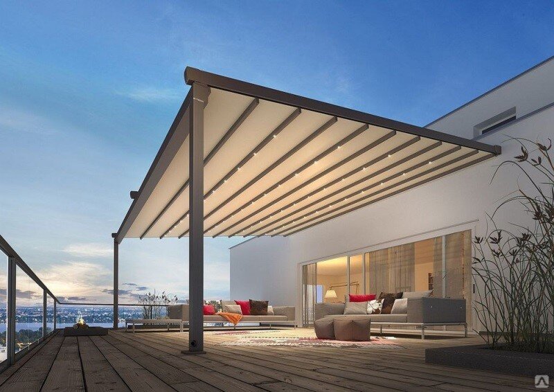 Дизайнеры и архитекторы просто ликуют от возможностей поэкспериментировать с плоской кровлей. Что же можно сделать на ней? Раздвижная крыша - практичный выбор. Раздвижное кровельное сооружение позволит полностью закрыть террасу в непогоду и на зимний период. В жаркие, солнечные дни конструкция будет затенять нужные участки, например, зону диванов или барбекю. Монтаж такой кровли стоит недешево, но функциональность, а также срок службы, оправдают затраты. Маркизы – ещё один вариант раздвижной крыши, который выглядит как акриловый шатер с каркасом из алюминия. Отличительная черта шатра в его способности отталкивать воду. Такая кровля оснащена шарнирной системой, поэтому вы можете регулировать ее наклон. Управление может осуществляться тремя способами: вручную, дистанционно или автоматически. Маркизы могут быть абсолютно разные, много вариантов дизайна, размеров, комплектации. Они будто созданы делать дом привлекательнее, воплощать любую архитектурную идею. Навес над кровлей. Классическ