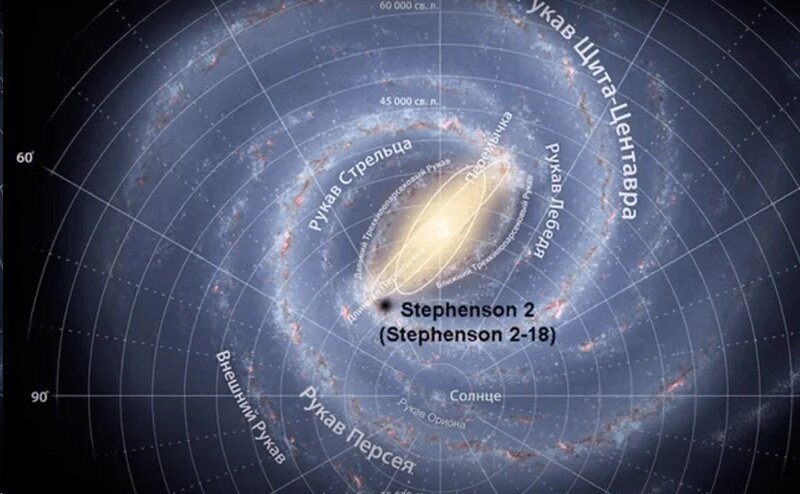 Где же Стивенсон 2-18 проживает? Она вместе со своей семьёй – скоплением расположена где-то на стыке длинной перемычки или перевала, и внутренней частью рукава Щита Центавра. Это пересечение северной оконечности бара перемычки Млечного Пути и его диска. Из карты галактики хорошо заметно, что нас разделяет не только внушительное расстояние, но и та самая толща газопылевых облаков, из-за которых мы не можем увидеть сияние этих светил в телескопы, а про невооружённый глаз и говорить нечего.