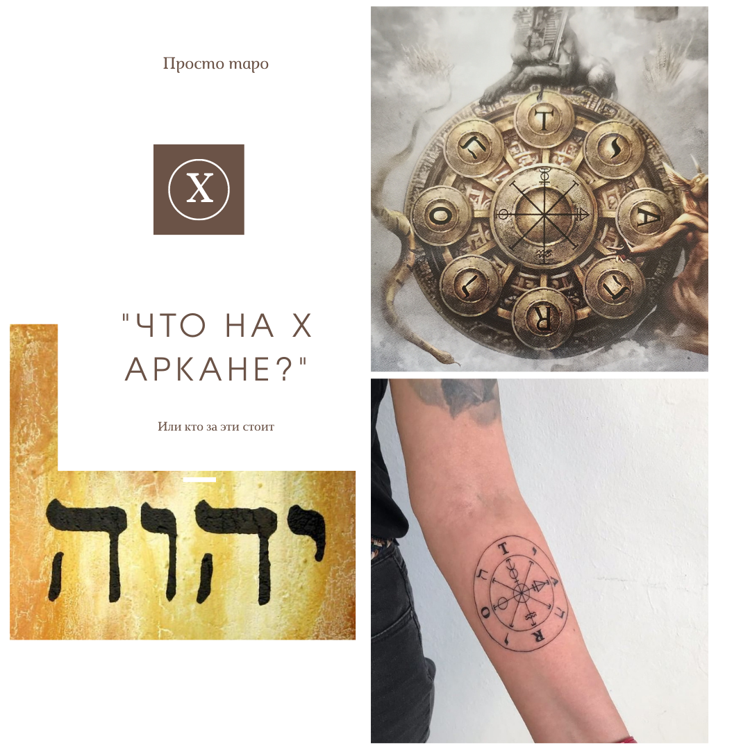 В середине расположено колесо, украшенное различными буквами и знаками. Это, во-первых, четыре еврейские буквы, составляющие тетраграмму - самое могущественное и личностное древнееврейское именование Бога и основное имя Бога в Ветхом завете.(Йод-Хе-Вав-Хе), и четыре латинские, образующие слово TORA — или TARO, если читать в обратном направлении.