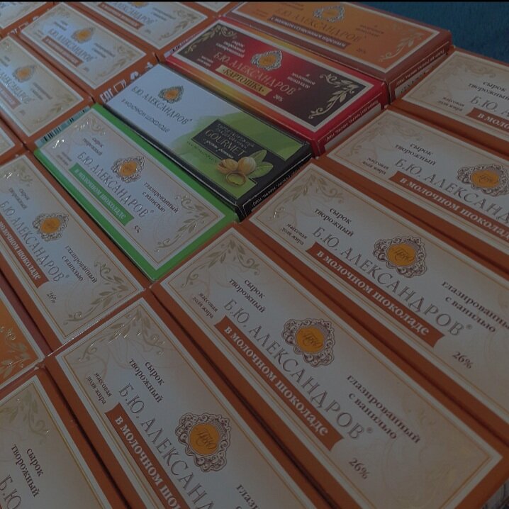 Изготовитель ООО РосАгроКомплекс Состав творог, шоколад молочный (сахар, какао- масло, сухое цельное молоко, какао- тертое, эмульгатор -соевый лецитин, ароматизатор натуральный, ваниль), сливочное масло, экстракт ванили. Так, ну что тут можно говорить- упаковка сырка выглядит шикарно и дорого, богато- стильная коробочка, внутри которой сырок в золотой обертке-смотрится это все очень гламурно, все переливается и блестит. Это самый дорогой образец глазированных сырков. Когда мы достаем сырок из упаковки, он оказывается идеально правильно и точной формы. Вместо глазури как нам и заявлено, сырок покрыт шоколадом. Сам шоколад безумно вкусный и нежный, быстро тает во рту. Сырная масса очень приятная на вкус. В сырке полностью отсутствуют растительные жиры. Отличное качество сырка чувствуется на вкус. Получился восхитительный десерт, который станет прекрасной альтернативой молочным десертам! Попробуйте сырок творожный от Б.Ю. Александров -и вы просто не сможете устоять! Приятного аппетита!