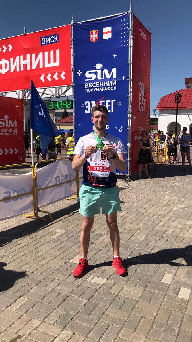 Ура, это свершилось🎉 Чуть больше года назад Мы зарегистрировались на Забег и произошло ЭТО🤯 Тотальный карантин и полная отмена всех спортивных мероприятий в частности ❌ И вот спустя год, стою на площади, где послезавтра тут будет несколько тысяч человек, собранных с одной целью, это реально нереально круто 🎯 Зарегистрировался на Полумарафон месяца два назад, с трудом и боем получил медицинскую справку (это отдельная история) и до последней недели переживал, не отменят ли старт. И вот заветный пакет участника с номером и футболкой получен 😎 День Х. Бежим вместе с другом. Рядом со стартом расположилось кафе, а мы в нем))) Сидим пьем чай/кофе в тени и комфорте, в то время как остальные участники жарятся на солнце. Время 11 утра и солнце уже греет воздух почти на 30 градусов плюс☀️ Ещё не стартанули, а уже жара нереальная. Я снял футболку и накинул на голову 🥵 Выстрел. Старт. Не успел включить часы и камеру. Включаю все на бегу 😄 Мне кажется меня окружают такие же «потерявшиеся»
