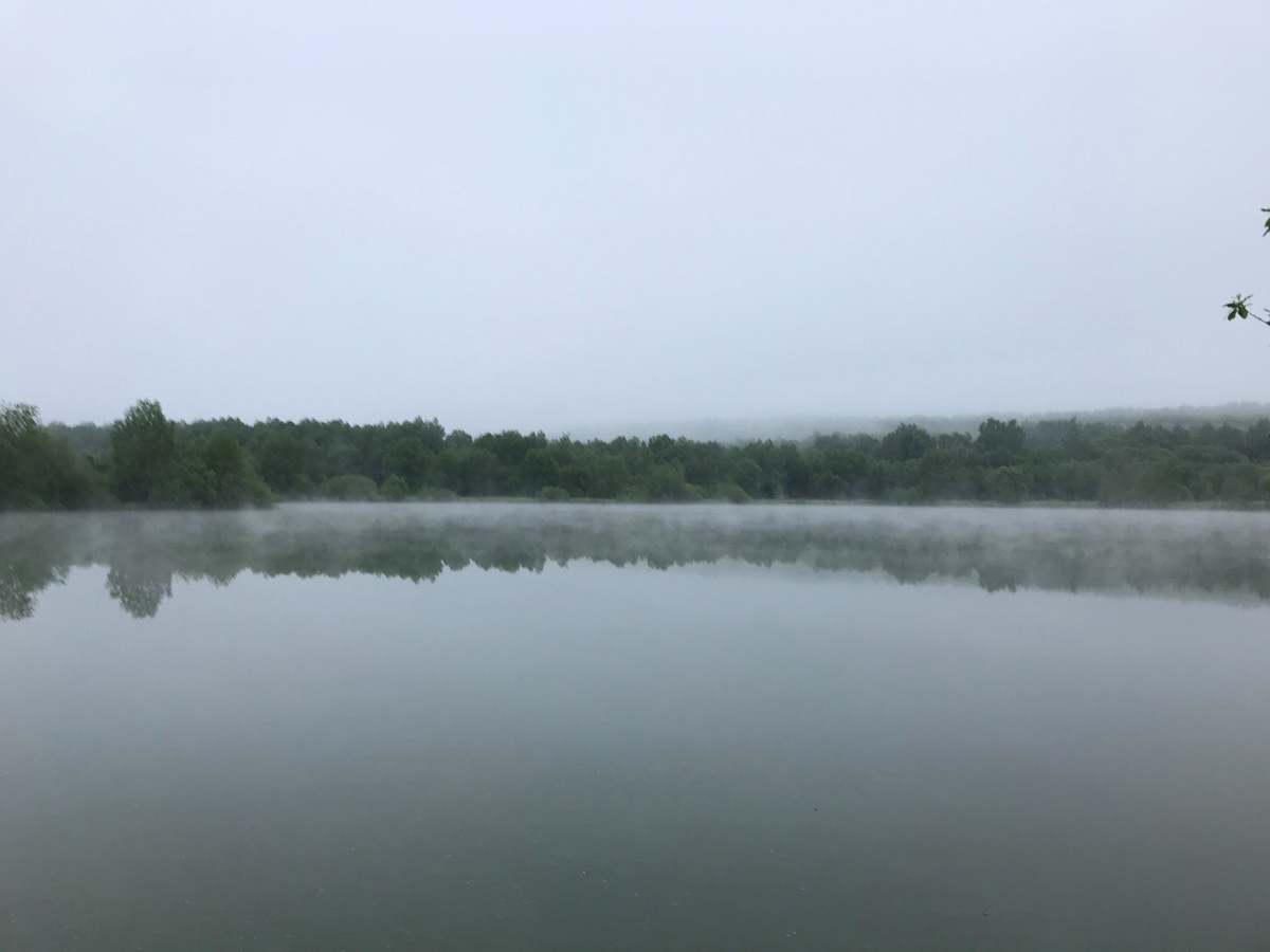 Доброго времени суток. В прошедший выходной я с товарищем, несмотря на спиннинговый запрет, отправился на рыбалку щуку с окунем половить. Выбор водоема был предоставлен моему товарищу, на котором он не плохо отлавливался в прошлом году. Водоем называется "Земснаряд". Расположен он в полях и на моей пузотерке, особенно после дождя, не проехать, а как раз вечером перед рыбалкой прошел хороший дождь. Подъем в 03:00, недолгие сборы, заезжаю за товарищем и около 4 утра паркуемся до куда смогли доехать, дальше пешком по полю. Двадцати минутный пеший поход до водоема вместо зарядки и в 04:20 мы на месте. С виду прудик многообещающий. Вода в подъеме из-за дождей . Ну что, собираем спиннинги, пора рыбу ловить. Спрашиваю у товарища какая глубина тут примерно, чтобы подобрать вес чебурашки для джига. Он говорит, что метра 2-3. Ставлю 7 грамм, двух дюймовый красный виброхвост. Поехали. Первый заброс недалеко от берега и я жду порядка 30 секунд, пока приманка упадет на дно. Мда... Я может и не пр
