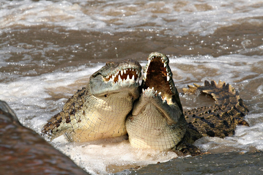 Крокодилы, это самые настоящие каннибалы, поэтому драки между собой у них не редкость. Гребнистый крокодил, предпочитает сразу уничтожить жертву, в то время как Нильский скорее утопит ее, а уже потом приступит к обеду. Крокодилы одни из древнейших существ на Земле. За миллионы лет они практически не эволюционировали, и выглядят примерно так же как раньше. Иерархия в стае Нильских крокодилов выражена более четко, в то время как Гребнистый не станет спрашивать разрешения у старших особей, в каком месте ему полежать на солнышке. Именно нарушение иерархии может стать поводом драки Нильского и Гребнистого крокодилов, которые встречаются между собой крайне редко. Нильский и Гребнистый крокодилы очень похожи друг на друга, эти две грозные рептилии, наводят ужас на всех животных планета, а так же на человека. Гребнистый крокодил, более темнее Нильского по цвету и имеет гребни. При этом, Гребнистый крокодил крупнее Нильского, который в свою очередь более ловкий и быстрый на суше. Нильские крок