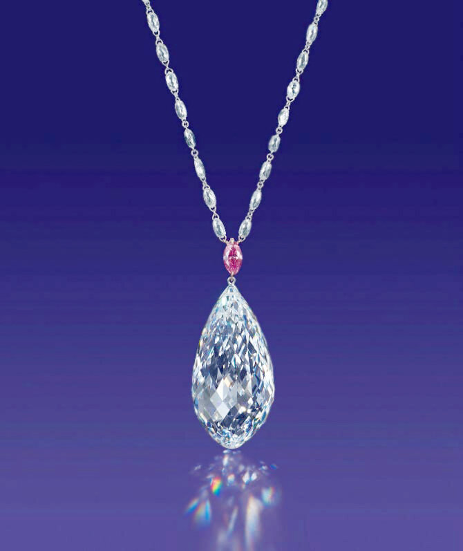 Изюминкой этого потрясающего ожерелья является огромный бриллиант массой 75,36 карата, но в украшение также входит лилово-розовый бриллиант огранки «маркиз», подвешенный над бриолетом. Два бриллианта соединены цепочкой с бриллиантами на шее из 18-каратного розового и белого золота. Это уникальное бриллиантовое колье из бриолетов было продано более чем за 11 миллионов долларов.