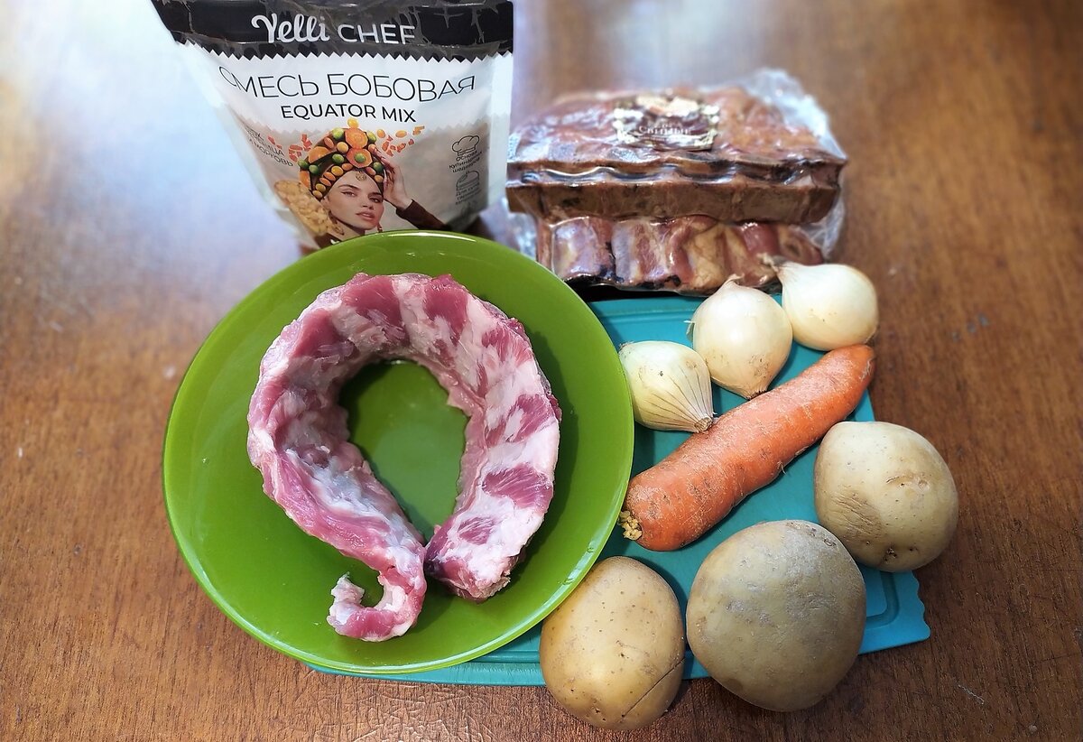 Готовый бульон доводим до кипения, добавляем бобовую смесь и варим 30 минут. Натираем на терке морковь, картошку нарезаем кубиками, мелко нарезаем лук. Копченые ребра так же нарезаем на куски.