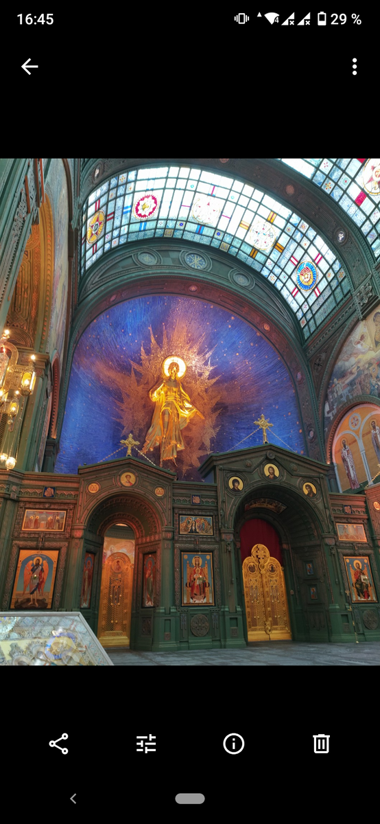9.05 День победы! Мы в Москве. Утро свежее, влажное. Монастырь в парковой зоне. Мы были первые к Святой Матроне! Купили по традиции розочки, мне досталась бардовая. Я её возложила у раки для освящения, а взамен мне дали белый чудесный бутон розы, уже освящённый. Перед тем ,как пойти на литургию, прогулялась по парку. Запах ни с чем не сравнимой утренней свежести. В конце службы Исповедь и Причастие. А потом у мощей нам монахиня дала маленькое послушание : читать о здравии имена людей (а в это время монахини где-то читали Псалтырь). Ну разве не чудо? Уезжая , увидела на шпиле фигурку ангела, словно провожающего нас. Затем побывали в Донском монастыре, точнее в 2-х его храмах. В большем приложились к мощам Святого патриарха Тихона, что стал патриархом в 2017 г. после 300-летнего перерыва ( Петр I упразднил патриаршество ,после чего церковью руководил синод ). Затем попали в храм Воскресения Христова (Главный храм Вооруженных сил РФ), посвященный 75-летию победы в ВОВ . Храм богатый, рос