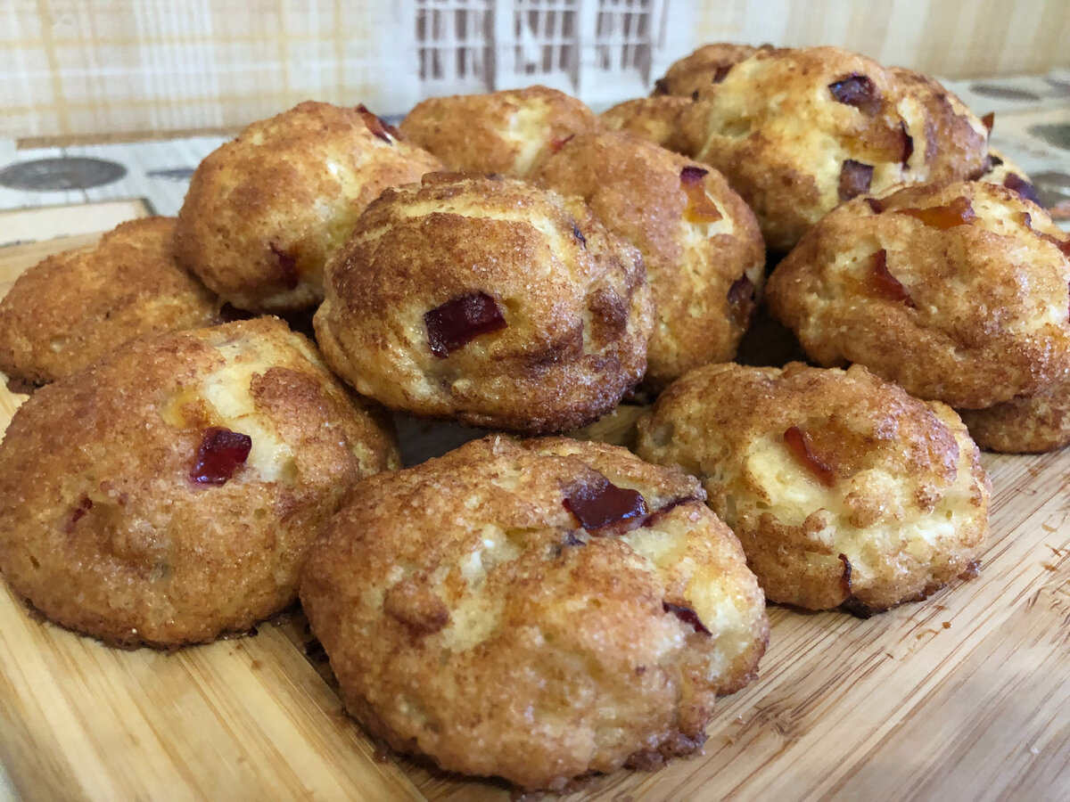 Добрый день, дорогие читатели! Сегодня готовим очень вкусное творожное печенье с необычной начинкой. Рецепт очень простой, а получается шедевр! Нежная мягкая серединка с хрустящей сахарно-коричной корочкой. Очень вкусное лакомство – рекомендую! Ингредиенты: Начинка: Способ приготовления: Духовку сразу ставим разогреваться до 180 градусов, т.к. тесто мы приготовим очень быстро. К творогу добавляем сахар, щепотку, растительное масло (либо растопленное сливочное), 1 яйцо и 1 ч.л. ванильного сахара. Все тщательно перемешиваем лопаткой. Фрукты очищаем и нарезаем небольшими кубиками. Добавляем фрукты в тесто и перемешиваем. Муку смешиваем с разрыхлителем (или содой) и постепенно просеиваем к остальным ингредиентам, замешивая тесто. Тесто должно получиться мягким и не липнуть к рукам. Набираем тесто по 1 полной чайной ложке с горкой и формируем шарики, смоченными в воде руками, либо смазанные растительным маслом. Сахар смешиваем с корицей. Каждый шарик обваливаем в сахарно-коричной смеси. За