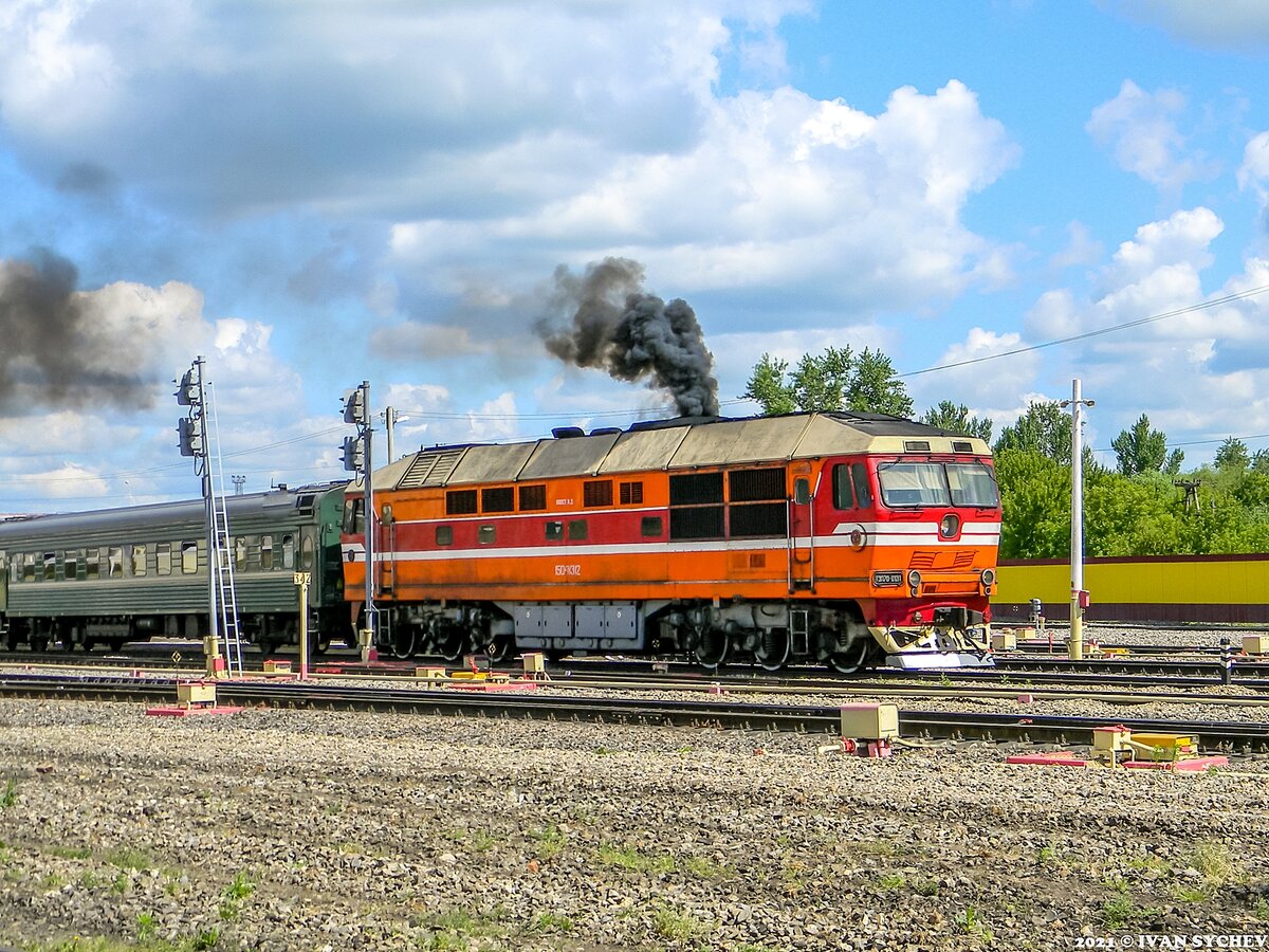 Заголовок сегодняшнего обзора честно приватизирован с названия сказки, которая "Маша и медведь". Но если в сказке медведь - все же действительно медведь, то в железнодорожном жаргоне слово "медведь", точнее даже выражение "дать медведЯ" (на последний слог ударение) имеет несколько иносказательное значение. Говорят, оно берет начало еще в паровозную эпоху. Суть в том, что машинист, который "дал медведЯ", на самом деле просто выпустил густую струю черного дыма. Далее этот "термин" перешел и к тепловозам, среди которых безоговорочным "Лидером" по выполнению такого "трюка" является тепловоз 2ТЭ10М с дизелем 10Д100. Но сегодня речь не о них, а о пассажирских тепловозах ТЭП70, "тапках" (да, знаю, "тэпках", но это уж где как приинято, а я чаще слышал именно "тапок"). Такие тепловозы как-то обычно не склонны выбрасывать черный дым, но у меня кое-что нашлось. Итак, поехали? 1. Начнем с тепловоза, фотография которого, собственно и подтолкнула к сегодняшнему обзору. Итак, ТЭП70-0131 с пассажирски