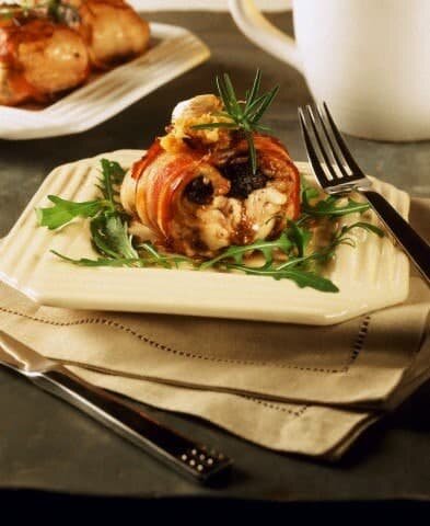 - Раскатать лепешки, в центр каждой поместить чернослив, слепить края, сформовав котлеты, завернуть их в ломтики бекона, сколоть шпажками и обжарить в разогретом на сковороде топленом масле.