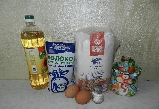 Ингредиенты Как приготовить Шаг 1: Шаг 2: Готовим блинное тесто. Вбиваем в миску для замеса теста яйца. Добавляем сахар. Шаг 3: Все хорошо взбиваем миксером или блендером с насадкой в виде венчика. В конце процесса добавляем соль и еще немного взбиваем. У нас должна получиться пышная масса. Шаг 4: Шаг 5: Всыпаем просеянную муку и еще раз перемешиваем Шаг 6: Вливаем растительное масло и перемешиваем последний раз. Тесто готово. Даем ему немного постоять. Шаг 7: Подготавливаем сковороду для жарки блинов. Для этого ее надо хорошенько накалить, смазав растительным маслом. Лично я для этого использую очищенную половинку картофелины, насаженную на вилку. Тесто набираем половником с самого дна, чтобы мука не успевала оседать. Если вам кажется, что растительного масла маловато, можно подлить еще. Выливаем на сковороду небольшое количество теста и ворочаем ее в разные стороны, равномерно распределяя тесто тонким слоем. Шаг 8: Жарим блин с одной стороны до зарумянивания и переворачиваем на другу