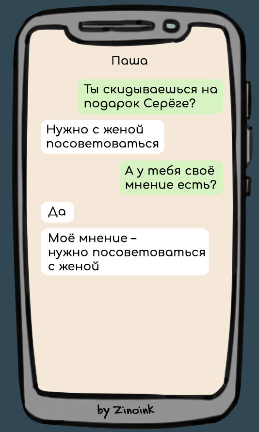 Привет, дорогой друг! Сегодня я бы мог начать статью с поздравления, ведь вчера наступило календарное лето. Вроде как это хороший повод пребывать в прекрасном расположении духа, но с другой стороны, первый день лета — это же не миллион рублей, который упал на карту просто так. Это не слава и популярность на телевидении или в интернете и даже не случайно найденные в кармане летней одежды 500 рублей. Если после моих сравнений твое настроение чуть подскисло, то я готов все исправить — в твоих руках новые смешные #смс переписки . Сегодня #сообщения будут посвящены общению с другом, который когда-то был крутым независимым парнем, а теперь только и делает, что соглашается с женой. Итак, представляю твоему вниманию 8 смешных переписок, в которых друг пытается доказать, что он не имеет ничего общего с мужчиной-подкаблучником. Перед тем как называть друга подкаблучником важно проверить все факты, ведь ситуации бывают разные. Может быть он озвучивает свое собственное мнение, которое лишь по случ