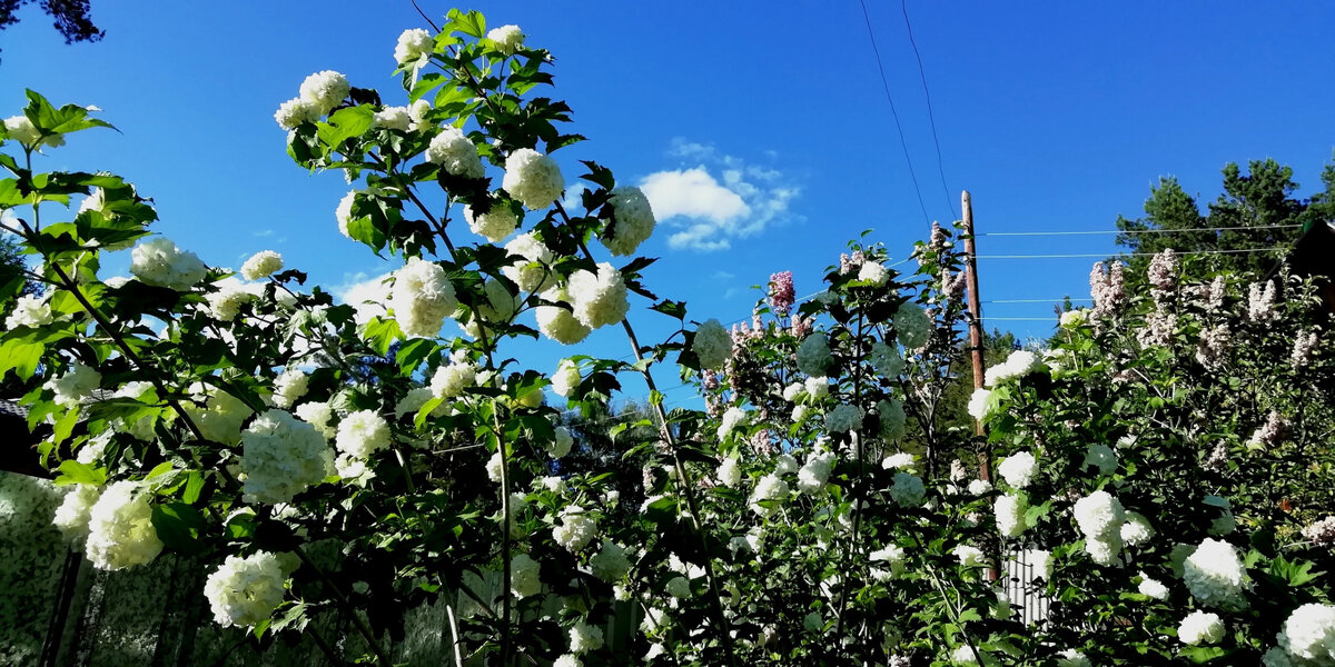 В самом конце весны на Урале зацветает калина. Сегодня в садах нередко высаживают морозостойкий декоративный сорт «Бульденеж», что с французского (Boule de Neige) переводится как «снежный ком». И, действительно, соцветия шарообразной формы ассоциируются со снежками, когда их цвет становится белым: в начале цветения они зеленые, позже светлеют. Одно из названий этой разновидности калины - снегула. Форма соцветий – признак отличия «Бульденеж» от обыкновенной калины, цветущей зонтиками. В остальном «родительское» растение и его разновидность очень похожи. При этом «Бульденеж» - чистый «декоративник»: соцветия обычно бесплодны и не образуют завязей, к тому же роскошное цветение характеризуется полным отсутствием запаха. Поэтому другое название бесплодной калины - «калина стерильная». Количество соцветий на калине зависит от возраста – чем старше растение, тем их больше. Поэтому весной нужно обрезать лишние побеги, а на время цветения установить опоры под ветви и стянуть куст по периметру