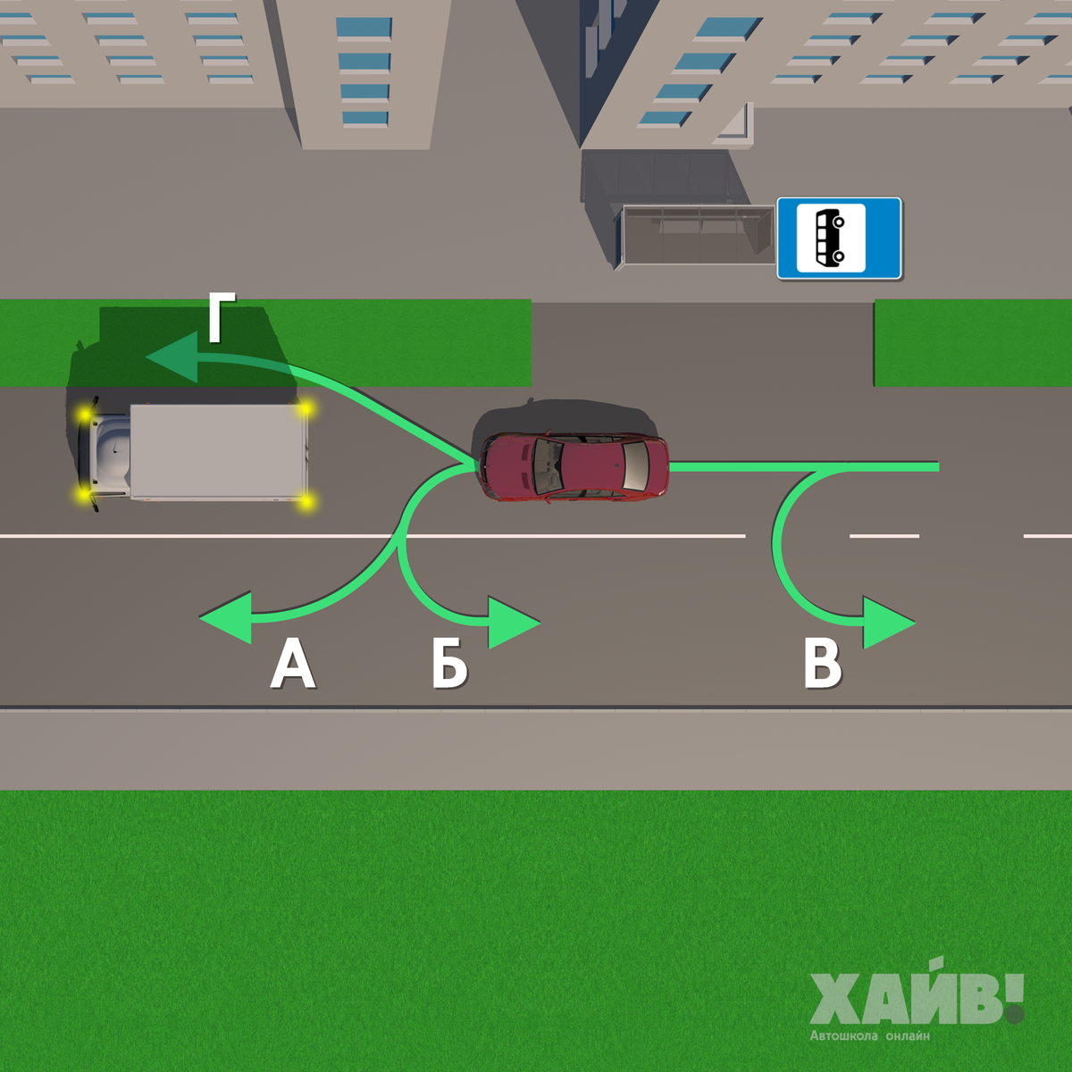 Перед красным автомобилем сломался грузовик. По какой траектории он может проехать, не нарушая ПДД? А как бы поступили вы?