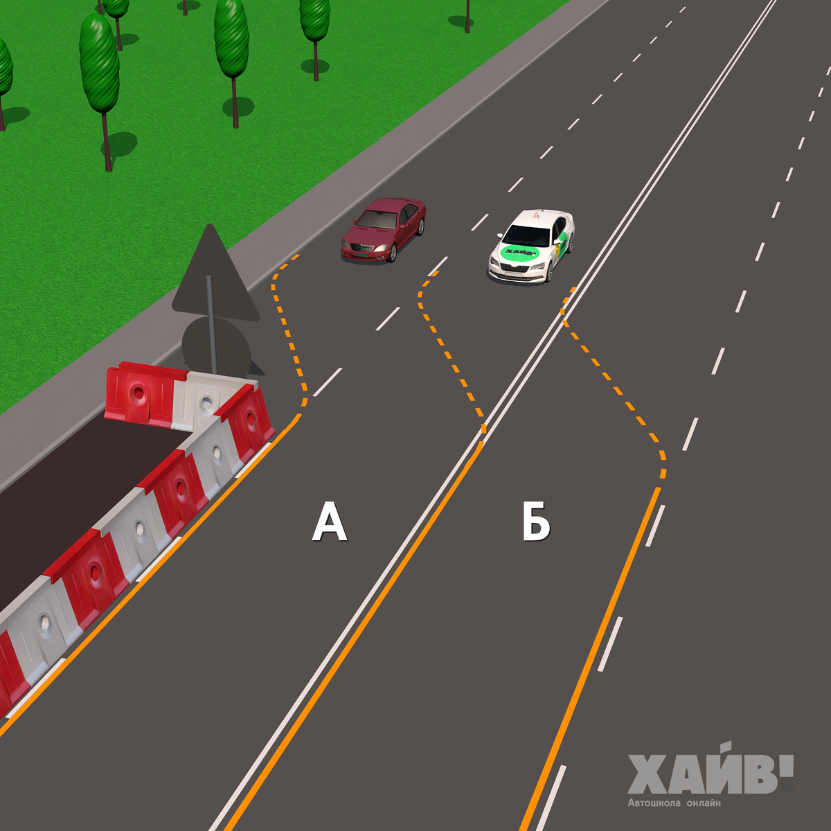 По какой из полос разрешено движение водителю учебного автомобиля? Пиши свою версию в комментариях. Наш ответ - ниже. Перестроения Кто начинает движение, уступает всем! Разберем ситуацию на следующем примере: На первый взгляд, может показаться, что красный автомобиль вправе тронуться в любой момент, ведь он поедет по своей полосе, никого не подрезая. Да еще и находится правее, нежели «учебка», собирающаяся перестраиваться. Однако ответ будет прямо противоположный. Учебный автомобиль имеет скорость и инерцию, поэтому ему потребуется время для торможения. Если он решит припарковаться на правой полосе в тот момент, когда красный автомобиль тронется, то может произойти столкновение. И кто же окажется виновным? Несомненно, тот, кто начинает движение. Так как ПДД гласят: перед началом движения водитель должен убедиться, что не создаст помех другим участникам дорожного движения. В противном случае он обязан оставить свой автомобиль в неподвижном состоянии. Перейдем к перестроениям и важному п