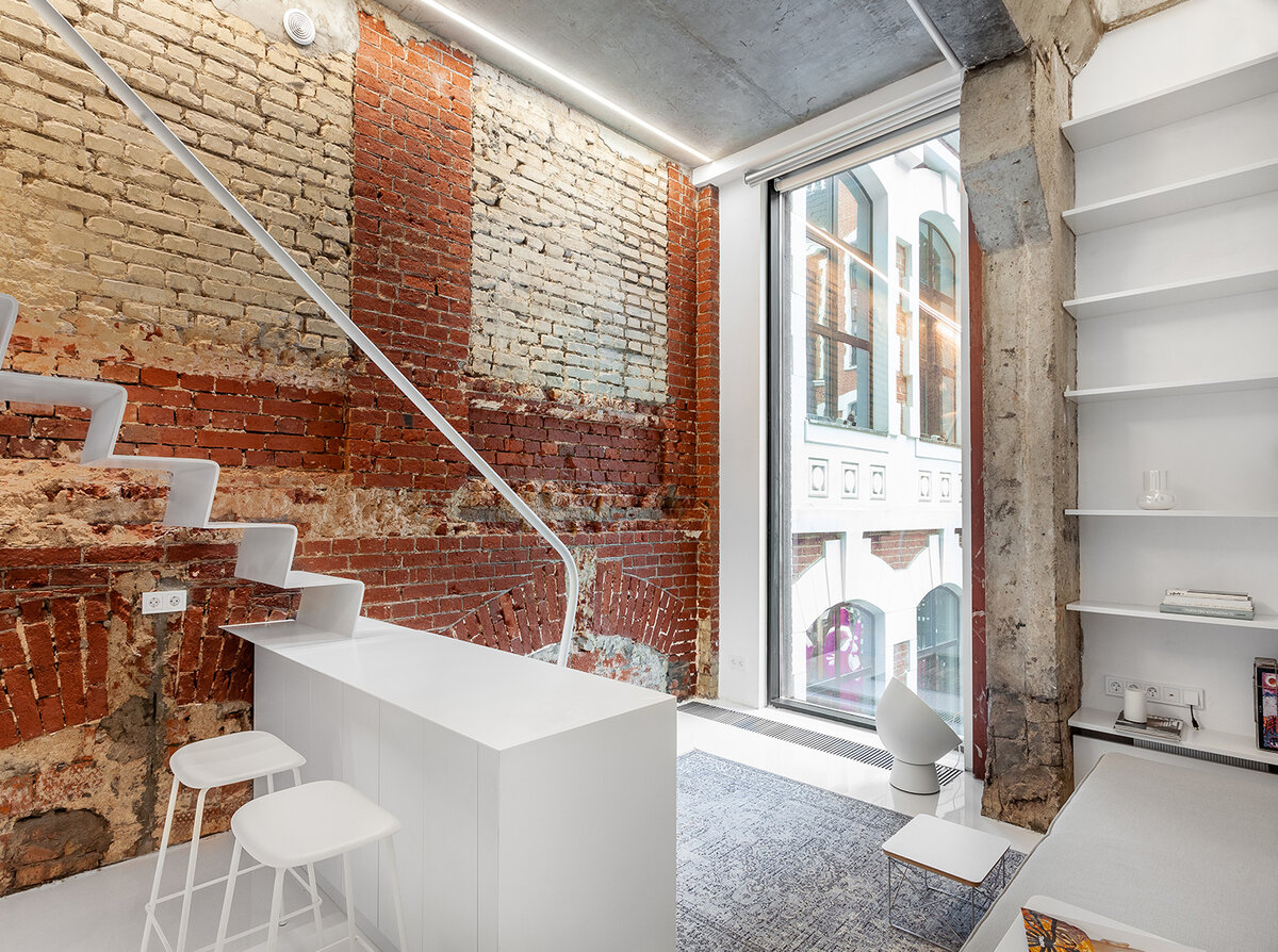 Анастасия Зайцева и Антон Лыско, Room Design Büro, завершили новый проект — маленькую квартиру площадью 27 кв. метров в московском ЖК бизнес-класса Loftec в Басманном районе. Ранее на его месте располагался завод счетно-аналитических машин им. Калмыкова. Несомненным достоинством исходного пространства стали высокие потолки 4,2 метра, а акцентами — красивая стена с исторической кирпичной кладкой и бетонные балки. Интерьер создавался для сдачи в аренду и жизни одного-двух человек. Заказчики, молодая, пара рассматривали этот проект как инвестиции и хотели, чтобы объект выгодно выделялся на фоне других аналогичных предложений на рынке недвижимости. Архитекторам удалось сформировать компактную антресоль, на которой расположили спальню и кладовую. Благодаря такому решению, полезная площадь квартиры увеличилась до 36 кв. метров. На первом уровне оборудовали гостиную с полноценной кухней и санузел с душевой. В отделке применили простые современные материалы — наливной пол, стены под покраску.