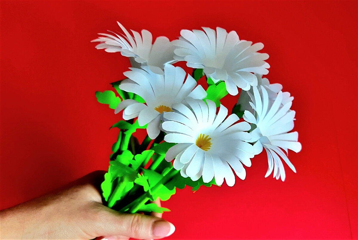 Всем привет!!! Ромашки-великолепные летние цветы, которые символизируют чистоту, красоту и любовь. Сегодня я покажу, как легко сделать их из бумаги . Они красиво выглядят и в отличии от живых цветов никогда не завянут. Для изготовления ромашек понадобятся белая и зеленая бумага, ножницы, клей, линейка, желтый фломастер или карандаш. На белой бумаге отмеряем квадрат 9 на 9 см и вырезаем его. Складываем наш квадрат пополам, затем еще раз пополам и по диагонали, как на фото Далее у получившегося треугольника отрезаем уголок и делаем три ровных надреза не доходя до вершины 1.5 см. Ножницами придаем форму лепестков, отрезая уголки у получившихся полосок. Разворачиваем заготовку, разделяя лепестки, где они вместе. Желтым фломастером рисуем серединку ромашки и ножницами делаем надрез до центра. Наносим немного клея на стороны и скручиваем заготовку в рожок. Должно получится вот так, как на фото Берем отрезок зеленой бумаги (10 на 20см) и с помощью шпажки или стержня от ручки скручиваем
