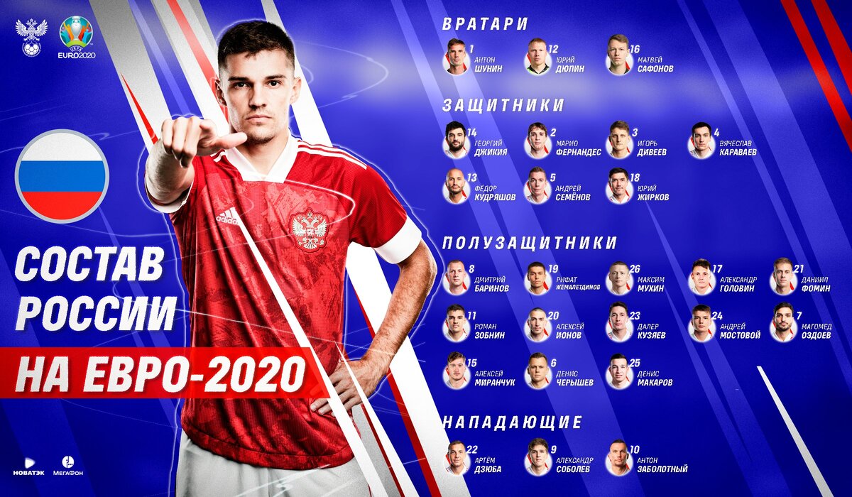 Вратари: 1. Антон Шунин («Динамо»), 12. Юрий Дюпин («Рубин»), 16. Матвей Сафонов («Краснодар»). Защитники: 14. Георгий Джикия («Спартак»), 2. Марио Фернандес, 3. Игорь Дивеев (оба — ЦСКА), 18. Юрий Жирков, 4. Вячеслав Караваев (оба — «Зенит»), 13. Федор Кудряшов («Антальяспор»), 5. Андрей Семенов («Ахмат»). Полузащитники: 8. Дмитрий Баринов, 19. Рифат Жемалетдинов (оба — «Локомотив»), 26. Максим Мухин (ЦСКА), 17. Александр Головин («Монако»), 21. Даниил Фомин («Динамо»), 11. Роман Зобнин («Спартак»), 20. Алексей Ионов («Краснодар»), 23. Далер Кузяев, 24. Андрей Мостовой, 7. Магомед Оздоев (все трое — «Зенит»), 25. Денис Макаров («Рубин»), 15. Алексей Миранчук («Аталанта»), 6. Денис Черышев («Валенсия»). Нападающие: 22. Артем Дзюба («Зенит»), 10. Антон Заболотный (ЦСКА), 9. Александр Соболев («Спартак»).