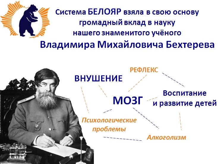 БЕХТЕРЕВ ВЛАДИМИР МИХАЙЛОВИЧ Владимир Михайлович Бехтерев исследовал большой ряд психиатрических, неврологических, физиологических, морфологических и психологических проблем. В своём подходе он всегда ориентировался на комплексное изучение проблем мозга и человека. Осуществляя реформацию современной психологии, разработал собственное учение, которое последовательно обозначал как объективную психологию (с 1904 года), затем как психорефлексологию (с 1910 года) и как рефлексологию (с 1917 года). Уделял особое внимание разработке рефлексологии как комплексной науки о человеке и обществе (отличной от физиологии и психологии), призванной заменить психологию. Бехтерев широко использовал понятие «нервный рефлекс». Ввел в оборот понятие «сочетательно-двигательный рефлекс» и разработал концепцию этого рефлекса. Открыл и изучил проводящие пути спинного и головного мозга человека, описал некоторые мозговые образования. Установил и выделил ряд рефлексов, синдромов и симптомов. Физиологические рефле