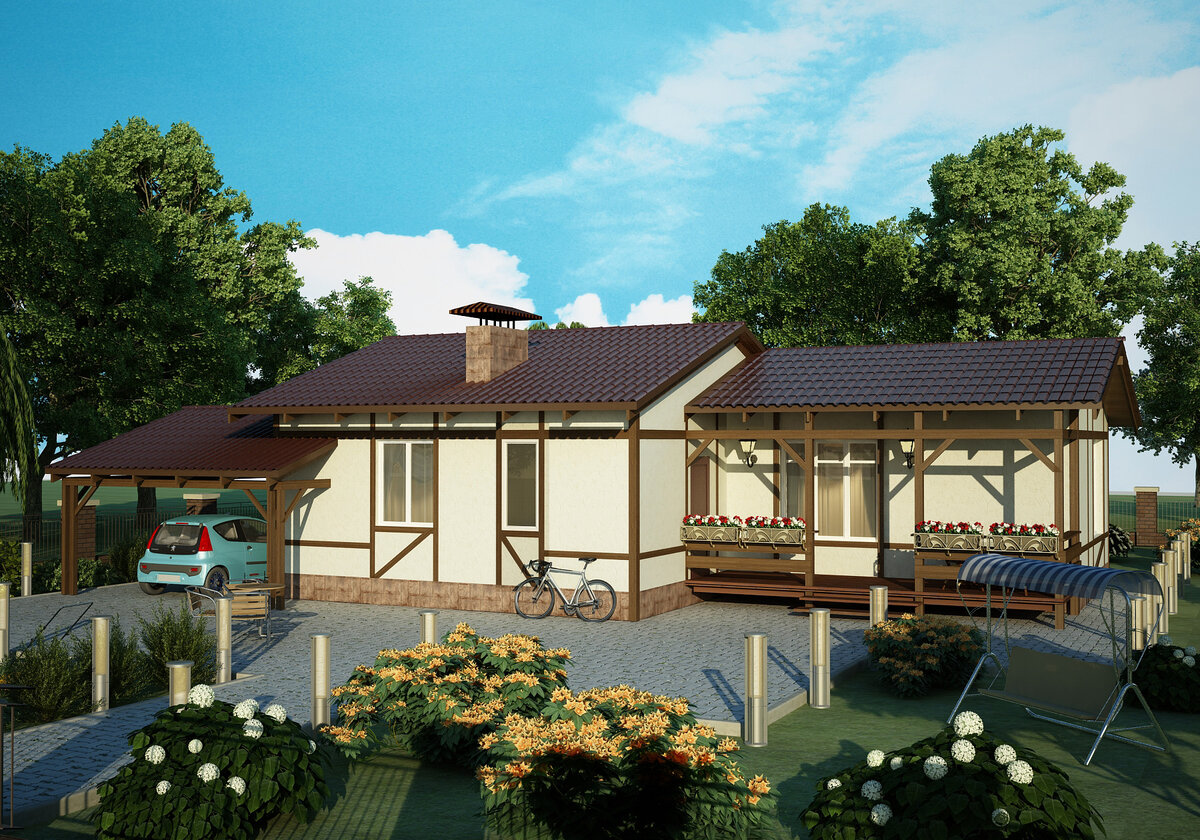 В этой статье я расскажу о ходе строительства дома, площадью 95 м2 с фотографиями. Обозначу сроки и стоимость возведения дома. Проект выполнен архитектурной студией Демидовых https://archcabinet.ru/ в стиле фахверк. Общая площадь, включая террасу составляет 95 м2. В доме имеется гостиная с обеденной зоной, отдельная кухня и две спальни. Котельная не была предусмотрена (по желанию заказчика). С подключением магистрального газа, двухконтурный навесной котёл можно установить на кухне. В соответствии с проектом был смонтирован навес для авто (фото в конце). По желанию заказчика архитектор изготовил два варианта внешней отделки дома. Второй вариант к фахверку имеет слабое отношение, но он оказался дешевле (штукатурные фасады удовольствие не из дешёвых). В конечном итоге мы реализовывали проект с установкой на фасадах имитации бруса. Дом был исполнен по каркасной технологии. Похожий проект мы реализовывали в этом же посёлк