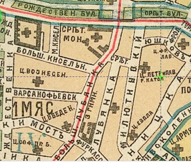 Бульварное кольцо уже недалеко! Это дома за Сретенским переулком. Дальний, четырехэтажный (Большая Лубянка №26) связан с семьей Андропова, будущего хозяина Лубянки. Семья была весьма непролетарская… По некоторым предположениям, Юрий Владимирович и родился здесь (хотя обычно называют другой пункт). Мне кажется, теперь от подлинного здания осталась лишь фасадная стена.