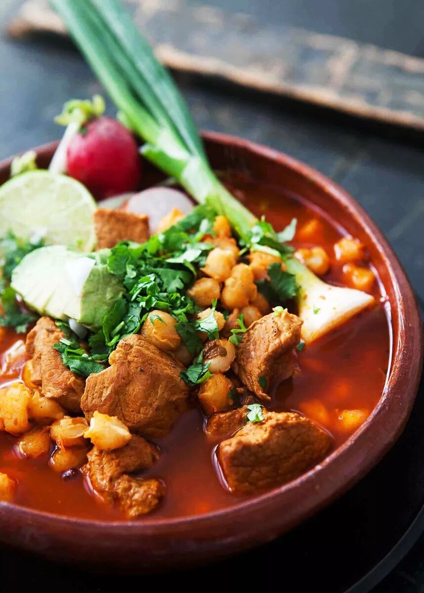 Традиционный мексиканский позоле (posole) - это густой суп, приготовленный из свинины, мамалыги и красного чили.
