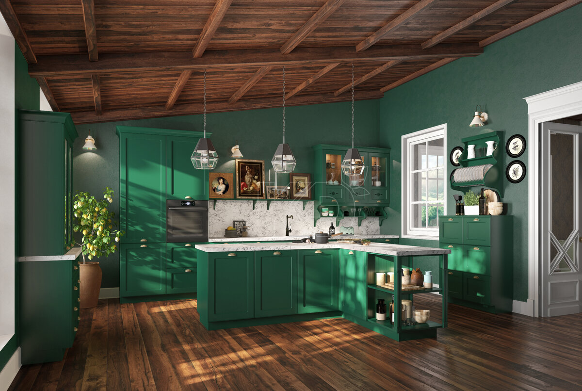 «Emerald» переводится как изумруд. Чарующе-зеленый цвет этого камня символизирует красоту, достаток и связь с природными силами. Достойный набор качеств, который пригодится и человеку, и современному дому. Наполнить этими качествами любой дом всегда готова «Адриана Эмеральд»! С этой кухней уют становится почти осязаемым, ведь её образ вдохновлён красотой канадского реликтового леса. В «Адриане» удивительным образом сочетаются открытые и закрытые зоны, стекло и глухие фасады из МДФ, выразительная фрезеровка и оригинальные ручки-полусферы. А от комбинации зеленых фасадов с белой столешницей просто не оторвать взгляд! «Адриана» не терпит переизбытка строгих форм, поэтому в её образе прямые линии гармонируют с плавными изгибами. Верхний ярус венчают классические карнизы, навесные ящики совмещены с изящными открытыми полками, а открытая зона хранения посуды имеет элегантные «волнообразные» торцевые части. Такое сочетание форм позволяет «Адриане» выглядеть безупречно в интерьерах любой площ