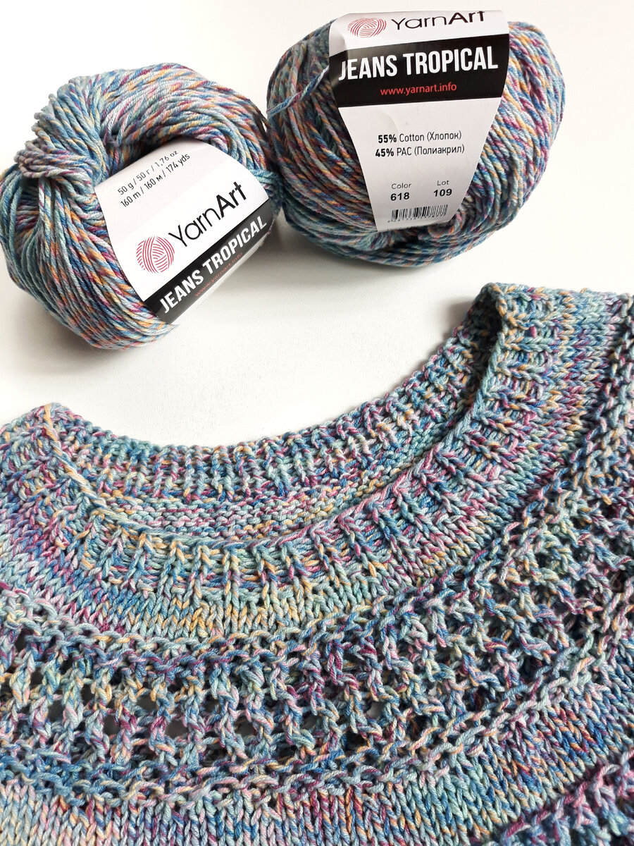 Футболка из Yarnart Jeans tropical с описанием Как обычно купила пряжу, потому что понравилась в мотке, совершенно не представляя, что хочу связать. Хотя нет, сначала связала тунику с длинными рукавами, надела на себя и потерялась в этом буйстве красок, распустила и отложила на "подумать". Потом на просторах интернета встретилась мне интересная футболочка, только из jeans crazy, автор @negor.ova. И тут звёзды сошлись, связала почти такую же, как у автора, только я все-таки сделала росток (сразу у горловины) и немного по-другому ажурные полоски расположила. Я сюда скопирую описание, оно для размера 46-48. Я себе вязала на 42 размер, набирала также 96 петель как в описании, но у меня плотность 18 петель в 10 см. У меня ушло 170 гр или 3,5 мотка. Футболкой я довольна, она как раз подходит на сезон между весной и летом, когда еще не жарко. *** Описание*** Вяжется сверху вниз, с круглой кокеткой, с подрезами, БЕЗ РОСТКА. Росток (по желанию) можно связать перед разделением корпуса и рукавов