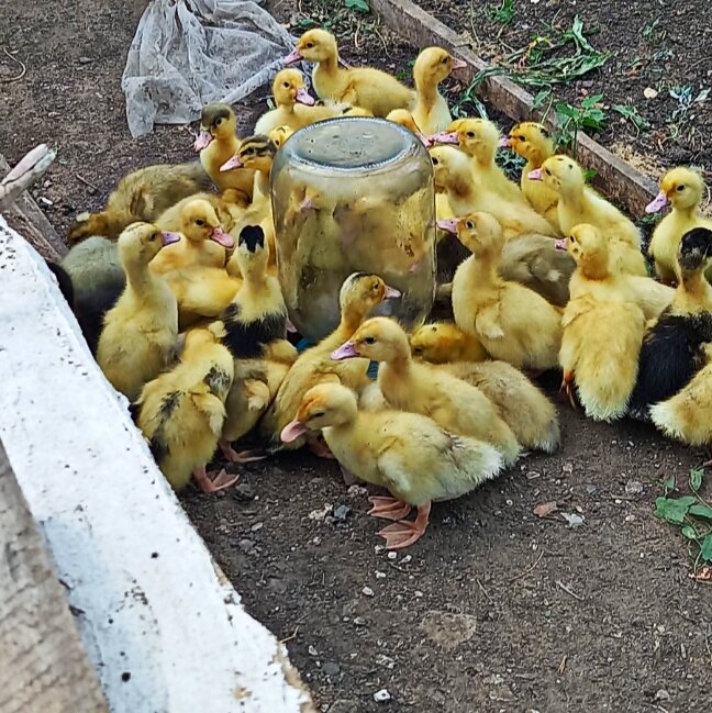 Ай посмотрите на эту прелесть.До чего же они прекрасны,не так ли? Эти прекрасные уточки приехали к нам вчера и мы даже не знали куда их поместить ,но спустя пять минут нашли все же им временное пристанище,а уже спустя два-три часа мы построили для них собственный уголок из подручных материалов,что оставались с прошлого года от постройки угольника.Смастерили для них кормушки и поилки,так как все хозяйственные магазины были закрыты, Но уже сейчас у них стоят новые предметы для лучшего их удобства так сказать.)