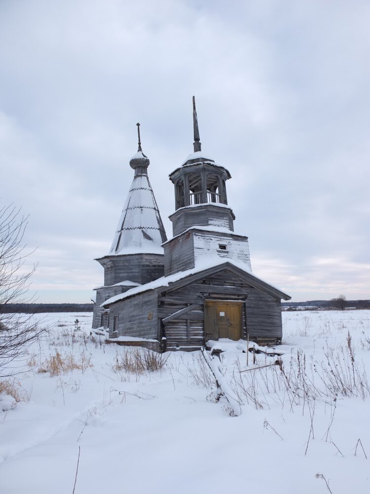 Через полкилометра движения по сугробу мы выехали на неплохую дорогу, по которой можно было бы и на машине проехать. Вспомнили, что по пути (как раз возле того довольно большого хозяйственного строения) видели отворотку налево. Видимо, по ней и надо было ехать. Мы с Денисом сняли лыжи и пошли по дороге пешком, переживая, что Саша уехал очень далеко вперёд: боялись, что потеряем друг друга (рации мы не взяли). Но когда настало время повернуть с дороги на тропу к Воймозеру, мы воссоединились с Сашей, снова встали на лыжи - и, по очереди съехав с горки и прокатившись по льду залива на озере, оказались в деревне. Поднявшись от залива и пройдя мимо нескольких домов, добрались до деревянной Пятницкой церкви.