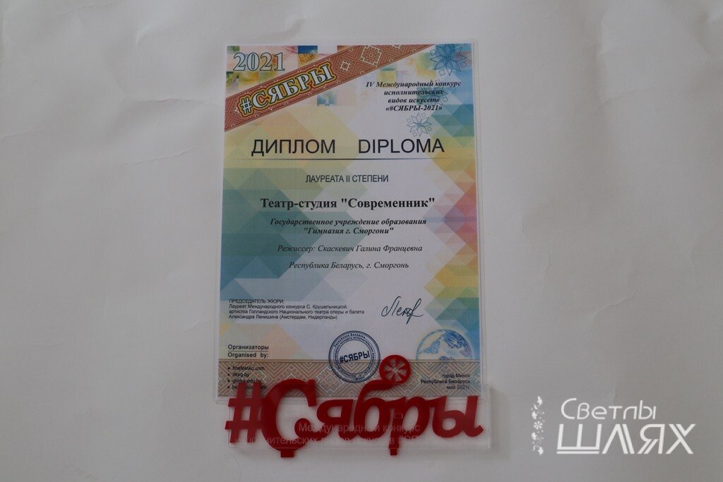 Участники театральной студии «Современник» за спектакль «Последние свидетели» получили Диплом лауреата ІІ степени на IV Международном конкурсе-фестивале исполнительского искусства «Сябры-2021». В спектакле «Последние свидетели» на сцену вышли маленькие артисты (гимназисты-второклассники) и проникновенно переживали свои роли – рассказывали истории детей, которые видели Великую Отечественную войну, смерть, пережили голод, многие потеряли близких, жили в интернатах… В спектакле были также задействованы учащиеся 9-11 классов. Выступление юных сморгонских артистов высоко оценило жюри, которое возглавила Александра Ленишина, артистка Голландского Национального театра оперы и балета. Как отметила руководитель театральной студии «Современник» Галина Скаскевич, вперёд сморгонцы пропустили только участников из Гомельского государственного университета имени Франциска Скорины.