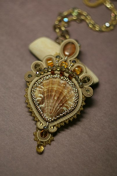 Добрейшего всем дня! Неделю назад мы поговорили о цветовом круге применительно к сутажным украшениям, а сегодня я начинаю переносить мастер-класс из этого же урока ШБИ, созданного замечательным мастером Юлией из Витебска, которую на Бисер инфо знали под ником Hotey. Кулон, который мы будем шить. Я выбрала одноцветную схему и сектор №12 (отсылка к предыдущей теме). Мой подбор материалов: Бусины. Сутаж. Бисер. Кто расстроился, что нет ракушки, не переживайте. Для этого кулона можно использовать все, что есть под рукой. Долго думала, какой же кулон придумать, чтоб было легко подобрать материалы в любых хомяческих запасах. И осенило меня внезапно, поэтому набросала эскиз на первом попавшемся клочке бумаги, думала перерисовать, а потом решила, что так интереснее, как бы с историей. В общем, думаю, под такие эскизы материалы найдутся у всех. МК по пошиву кулона. Обшиваем наш центральный элемент. Отмеряем сутаж, с учетом завитушек внизу. Отрезаем три ленты сутажа и оплавляем кончики зажигалко