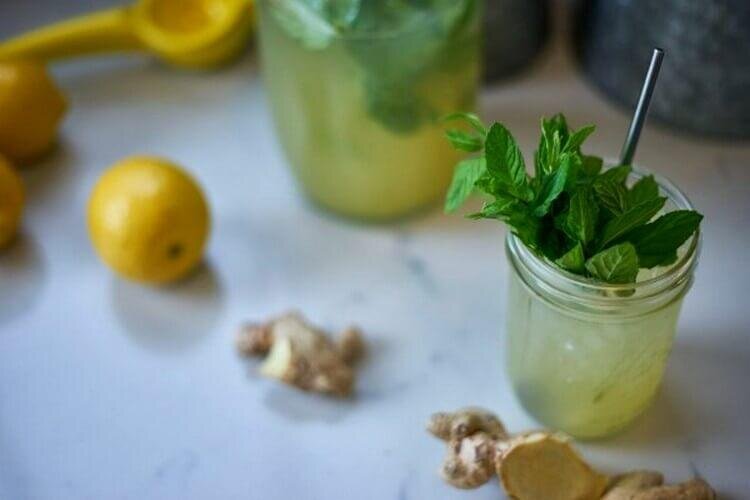 - Смешайте имбирный лимонад: добавьте 30-50 грамм очищенного и мелко натёртого свежего корня имбиря во время приготовления сиропа (дать настояться 30 минут). Имбирь отлично сочетается с мятой и другой ботаникой, а в качестве подсластителя лучше использовать мёд. Имбирь, как это ни странно, очень эффективен в борьбе с жарой.