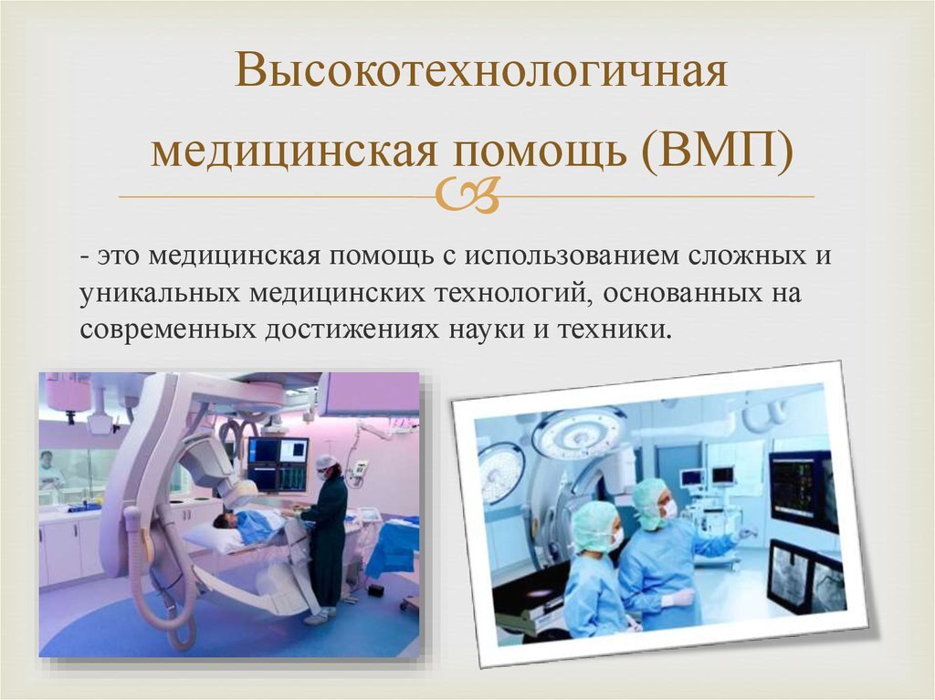 Многие из нас могут воспользоваться услугой ВМП, предоставляемой медицинскими учреждениями за счет федерального бюджета, но не знают, как. В этой статье представляется полное описание этой уникальной услуги, которой можно пользоваться без ограничений и бесплатно на протяжении всей жизни. Надеюсь, кому-нибудь это пригодится, как когда-то пригодилось мне. Высокотехнологичная медицинская помощь (ВМП) является частью специализированной медицинской помощи. ВМП включает в себя применение новых сложных и (или) уникальных методов лечения, а также ресурсоемких методов лечения с научно доказанной эффективностью, в том числе клеточных технологий, роботизированной техники, информационных технологий и методов генной инженерии, разработанных на основе достижений медицинской науки и смежных отраслей науки и техники. ВМП предоставляется в соответствии со стандартами медицинской помощи, утвержденными приказами Минздравсоцразвития России, в федеральных и городских специализированных медицинских учрежд