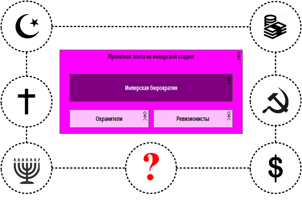 Имперская стадия ГП – Трансформация проектной элиты «Развитие проекта в иерархической стадии может продолжаться достаточно долго …» [4]. «Однако со временем слабеет дух носителей Идеи, портится мораль, все чаще допускаются послабления в нормах и правилах, а, значит, как опорная страна, так и весь проект в целом клонится к упадку. С этого момента опорная страна вынуждена вести себя как империя, или квази-империя. Эта стадия отличается от иерархической еще большей концентрацией элиты, резким «окостенением» проектных механизмов и, главное, переходом управления проектом от достаточно плюралистических элит к жестко организованной имперской бюрократии» [4]. Можно сказать, что на имперской стадии качество проектной элиты падает ниже критического уровня. Причин несколько: 1) Проектная элита замыкается в себе, прекращается приток свежих сил. 2) Приверженность проектной элиты системе ценностей и Норме ослабевает. 3) Значительная часть проектной элиты обюрокрачивается. У нее возникают собственные