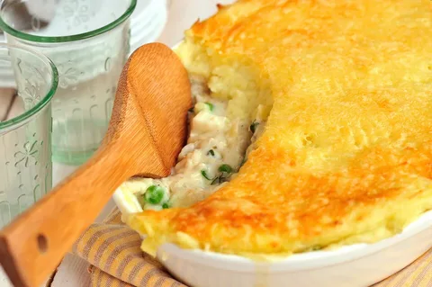 И так хотите удивить своих родных не обычным блюдом, тогда я вам советую приготовить рыбную запеканку. Нежная кремовая рыбная начинка, запеченная под картофельной шапочкой. Это блюдо отлично впишется на любой стол. нежная кремовая рыбная начинка, запеченная под картофельной шапочкой. И так главный вопрос этой статьи, как же приготовить это блюдо? Ингредиенты На 4 порции нам потребуется: Приступим к готовке данного блюда 1. Разогрейте духовку до 170 градусов. Рыбу положите в термостойкую посуду и залейте 400 мл молока. Накройте фольгой и отправьте в духовку на 30 - 40 минут или пока вы не сможете отделить рыбы кусочки пальцами. 2. Выньте рыбу из молока, сохраняя молоко, и разделите руками на небольшие кусочки. 3. Пока готовится рыба, почистите и отварите в подсоленной воде картофель до готовности. Слейте воду, накройте крышкой и отставьте в сторону, Также сварите вкрутую яйца, очистите и покрошите. 4. В сковороде растопите половину сливочного масла. Добавьте муку и готовьте на слабом ог
