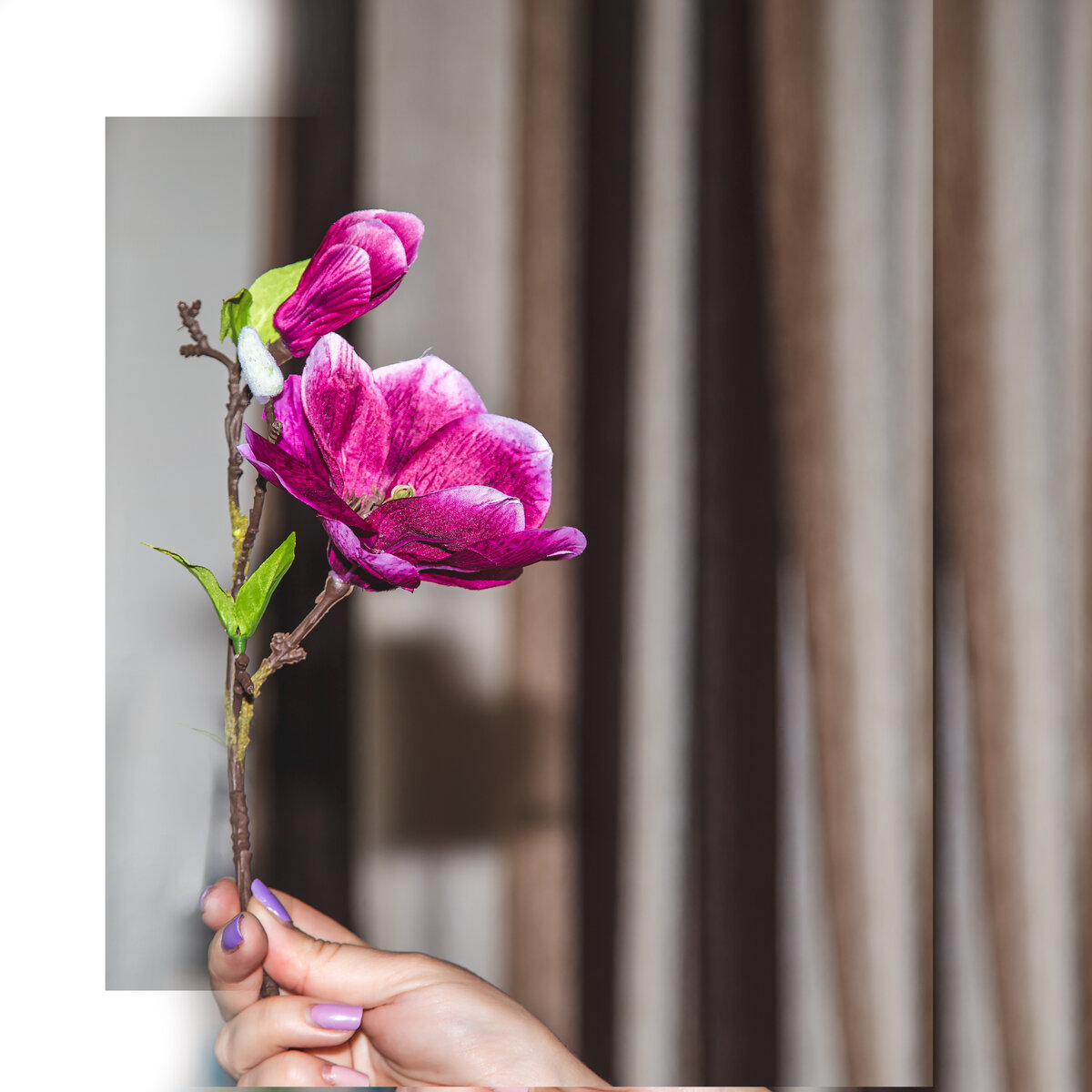 Так как предыдущая веточка орхидеи отлично «прижилась» в вазочке, то мне для фото конечно же понадобилась еще цветочная составляющая. Поэтому на этот раз я обратила внимание на такой красивый цветок, как магнолия. У продавца на выбор три расцветки, я оформила заказ на веточку с цветами винно-красного оттенка. Доставка пять недель с отслеживаемым треком. В процессе пересылки трек номер был изменен, так как данную посылку объединили с еще несколькими, поэтому получала все заказы в одной яркой посылке с логотипом JOOM на почте. Видео распаковки можно посмотреть на моем канале (Анастасия OptiMist_i_ka) Ютуб от 01.06.2021г Веточка приходит хорошо упакованной в почтовом пакете с «пупыркой» изнутри. При пересылке не пострадала. Лепестки и листики легко отпариваются утюгом с тефлоновой насадкой. Сама веточка полностью соответствует промо фото продавца. Длина около 37см, веточка насчитывает один распустившийся цветок, один бутон и одну пушистую почку. Сама я настоящую магнолию не видела, н